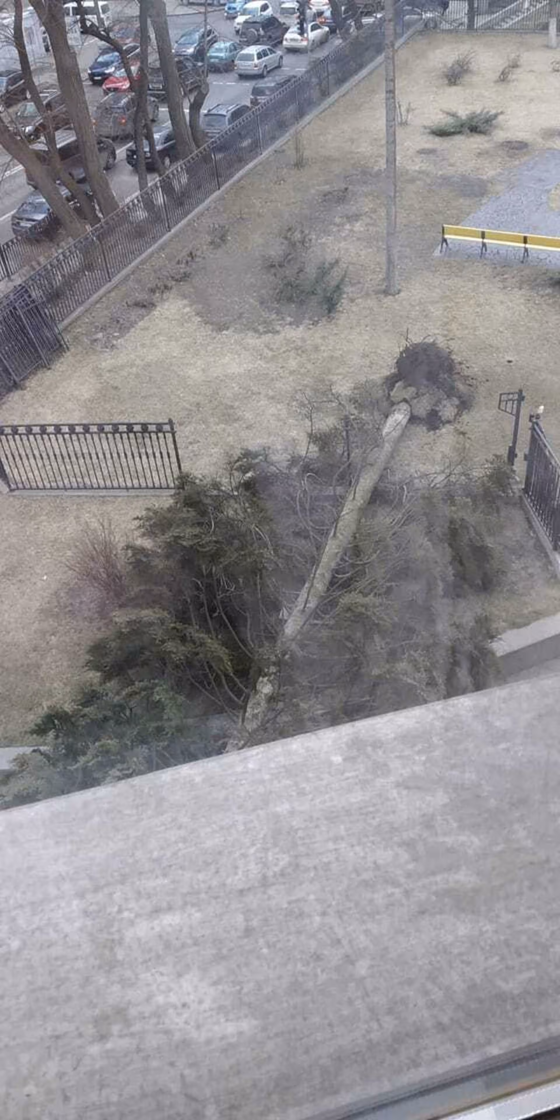 25-метрова смерека подряпала Верховну Раду: дерево гепнулось долу від вітру (фото)