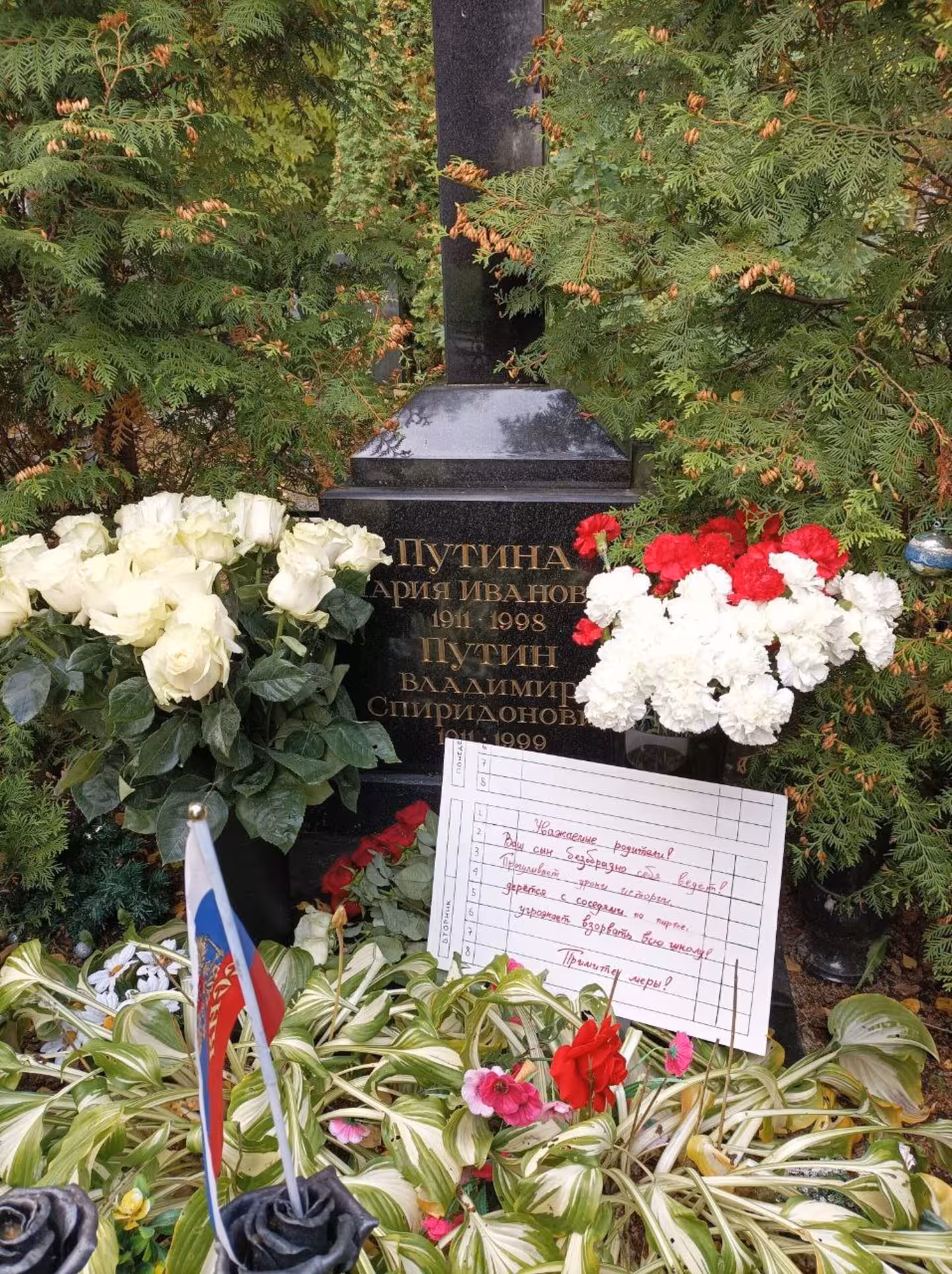 У Санкт-Петербурзі активісти «Партії мертвих» відвідали Серафимівський цвинтар, на якому поховані Марія Іванівна та Володимир Спиридонович путіни. На могилі батьків російського президента вони залишили послання, написане на аркуші, вирваному зі шкільного щоденника, повідомляє «Фокус».
