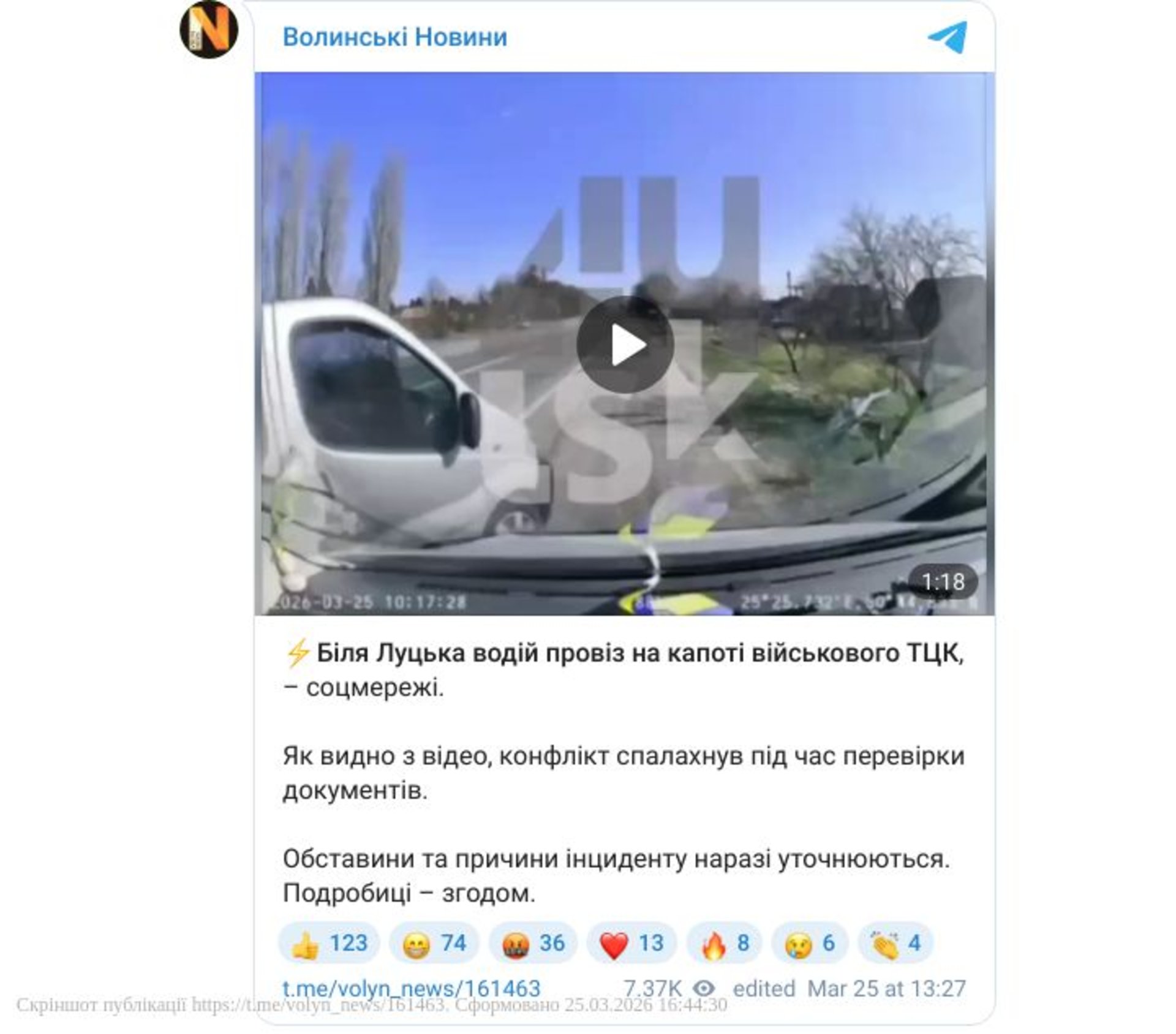 Біля Луцька під час проведення мобілізаційних заходів виникла конфліктна ситуація — військовослужбовця ТЦК збили з ніг і провезли на капоті автомобіля.