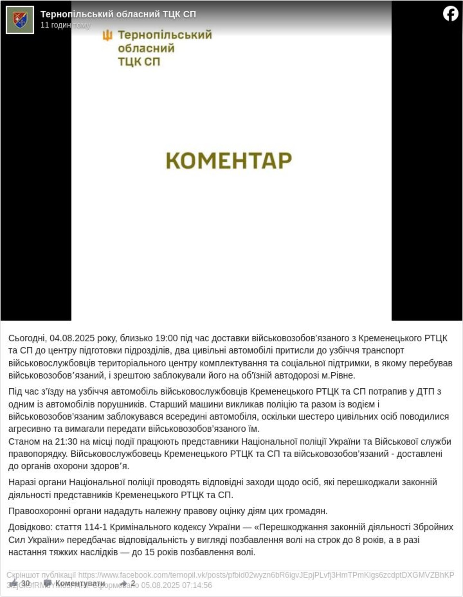 «4 серпня 2025 року, близько 19:00, під час доставки військовозобов’язаного з Кременецького РТЦК та СП до центру підготовки підрозділів, два цивільні автомобілі притисли до узбіччя транспорт військовослужбовців територіального центру комплектування та соціальної підтримки, в якому перебував військовозобовʼязаний, і зрештою заблокували його на об'їзній автодорозі м.Рівне.