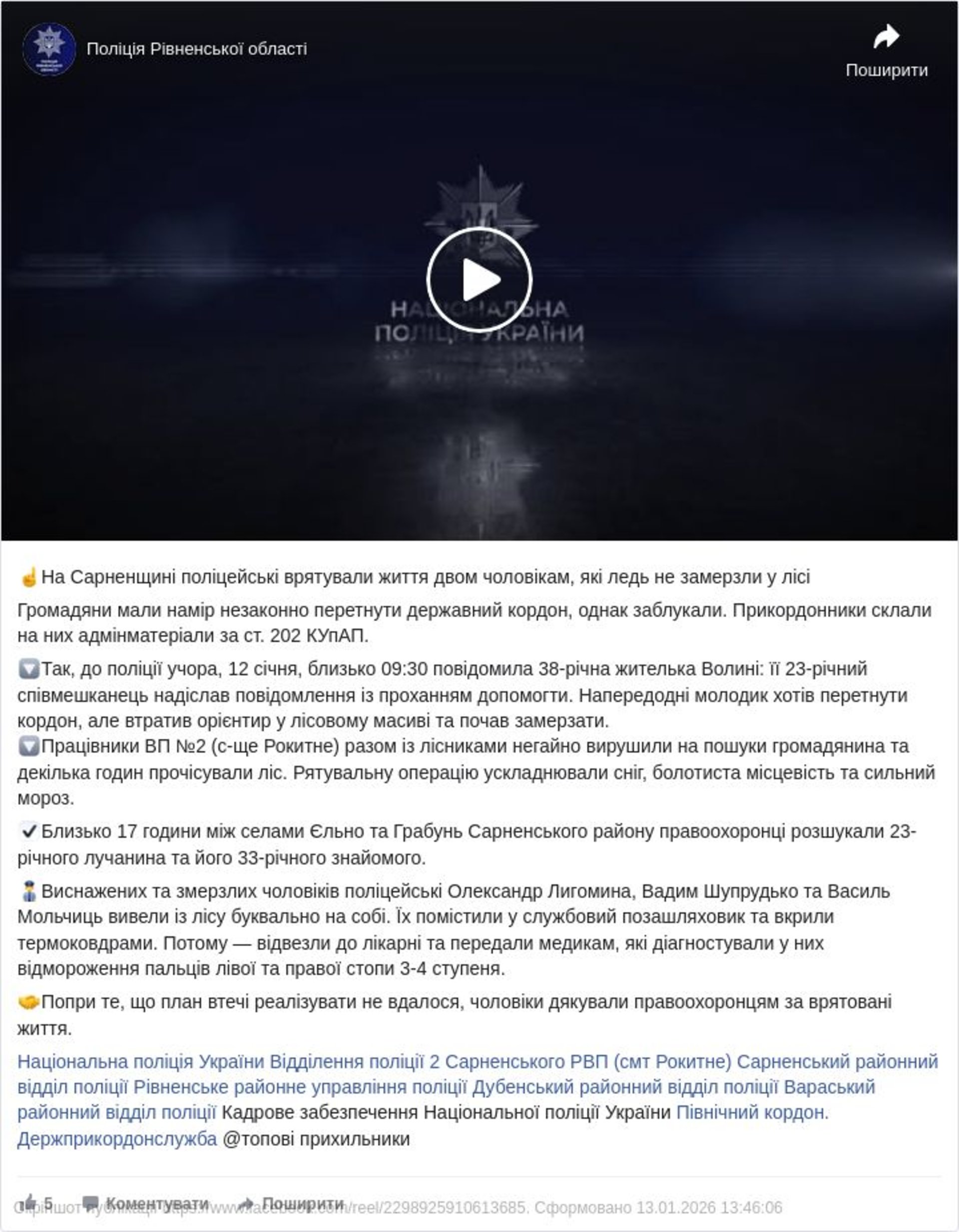 Близько 17 години між селами Єльно та Грабунь Сарненського району правоохоронці розшукали 23-річного лучанина та його 33-річного знайомого. Виснажених та змерзлих чоловіків поліцейські вивели із лісу буквально на собі. Їх помістили у службовий позашляховик та вкрили термоковдрами. Потому — відвезли до лікарні та передали медикам, які діагностували у них відмороження пальців лівої та правої стопи 3-4 ступеня.
