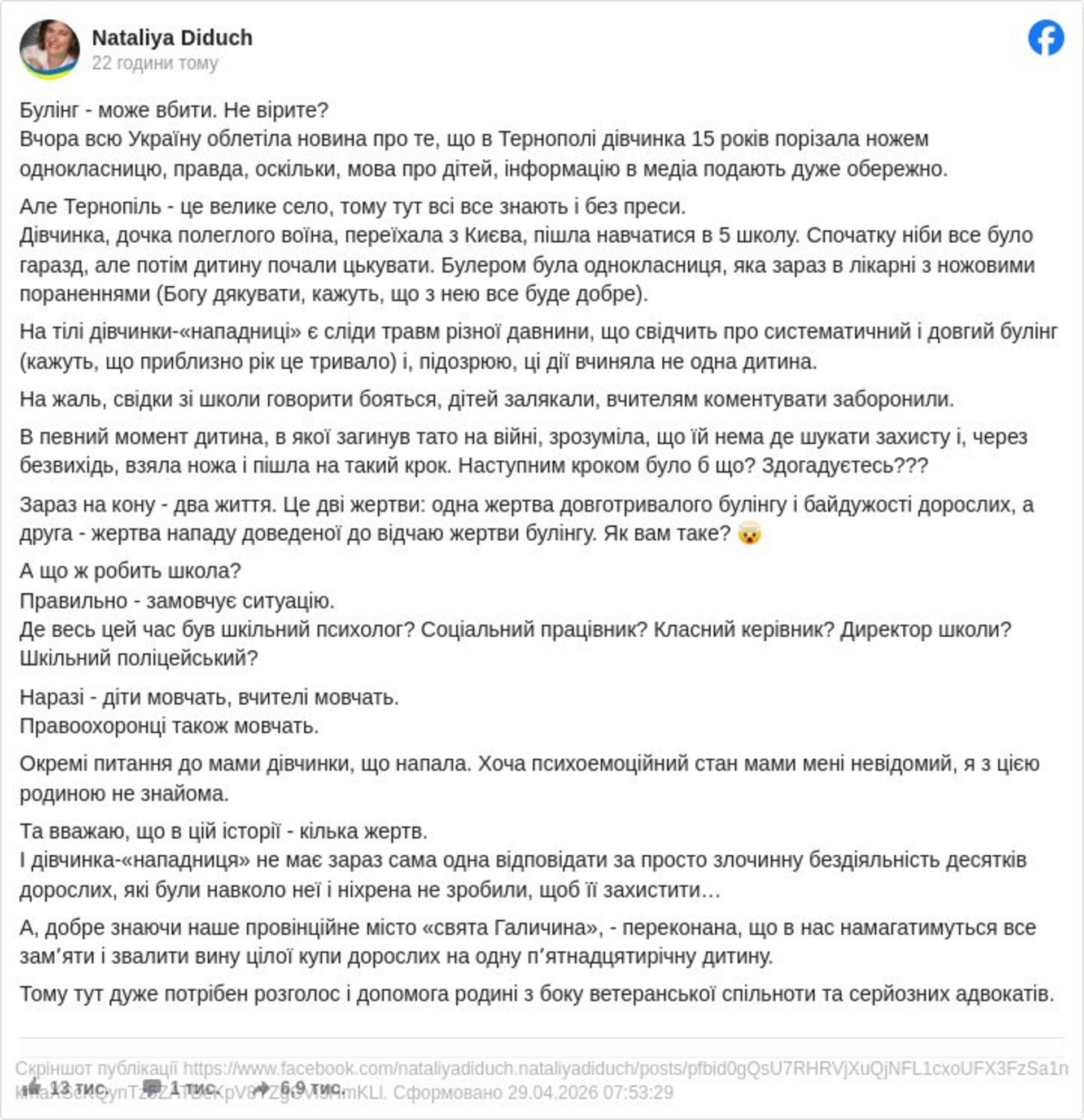 27 квітня 2026 року дев’ятикласниця однієї зі шкіл Тернополя підстерегла однокласницю в під’їзді її будинку та завдала їй кількох ножових поранень. Під час одного з ударів уламок леза залишився в голові потерпілої. Дівчину госпіталізовано, наразі її життю нічого не загрожує. Нападницю затримано. Мотиви вчинку встановлюються. Серед версій, яку перевіряє слідство, - можливий булінг з боку потерпілої. У разі підтвердження цим обставинам буде надано належну правову оцінку. Наразі готується клопотання про обрання підозрюваній запобіжного заходу.