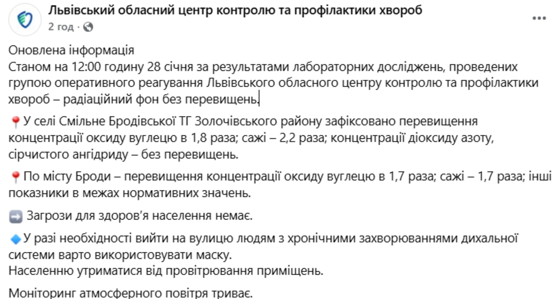 Людям із хронічними захворюваннями дихальної системи рекомендують тимчасово обмежити тривале перебування на вулиці та використовувати під час цього захисні маски. Залишаються актуальними рекомендації для всіх: утриматися від провітрювання приміщень; пити достатню кількість води протягом дня».