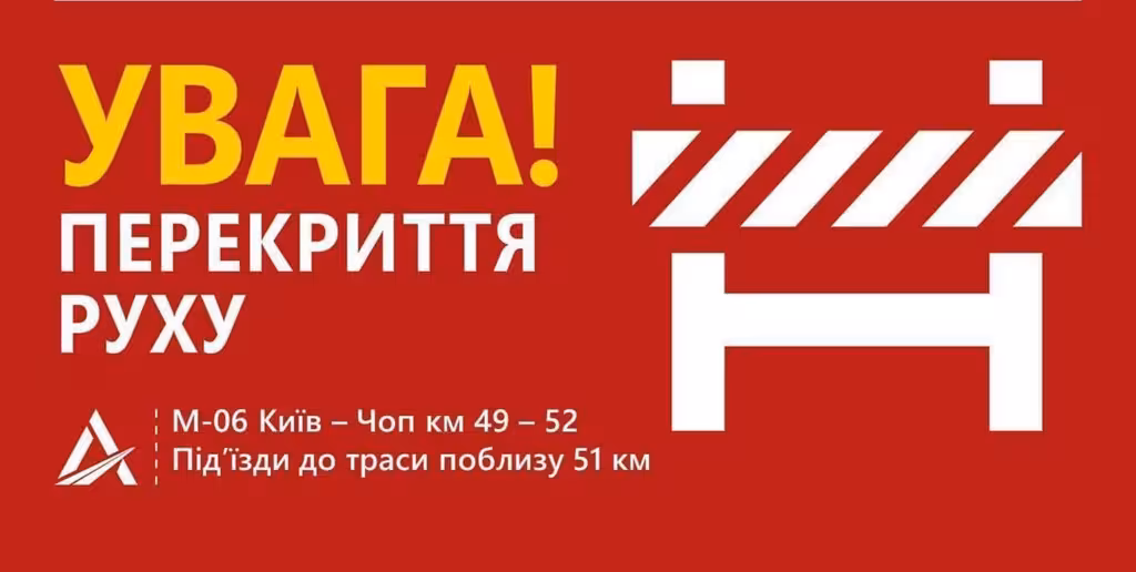 «З міркувань безпеки проїзд дорогою М-06 «Київ–Чоп» на ділянці з 49 по 52 кілометр Київська область — буде закрито. Також це стосується під’їздів до траси поблизу 51 кілометра. Обмеження набувають чинності сьогодні, 14 квітня, о 9:30 год і триватимуть щонайменше 3 дні», — йдеться у повідомленні.
