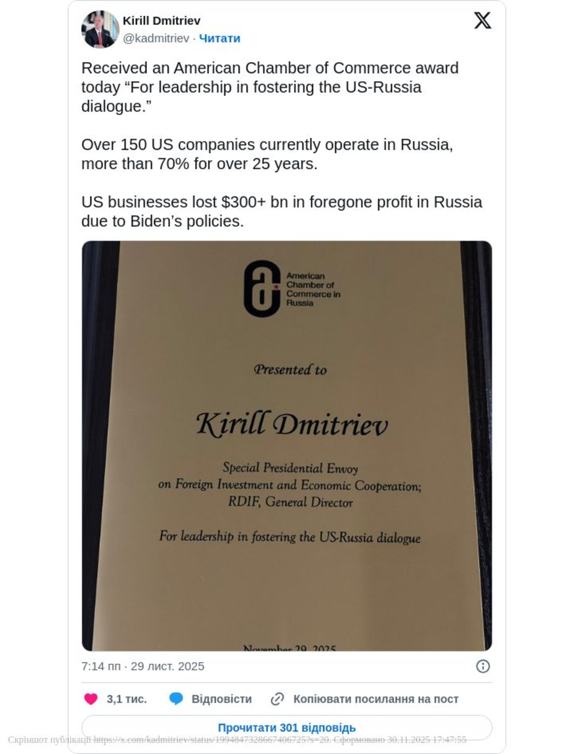 Спецпосланець Росії Кирило Дмитрієв заявив, що отримав нагороду за "лідерство у сприянні діалогу між США та РФ" від Американської торгової палати в РФ. Про це він повідомив на своїй сторінці у соцмережі X.