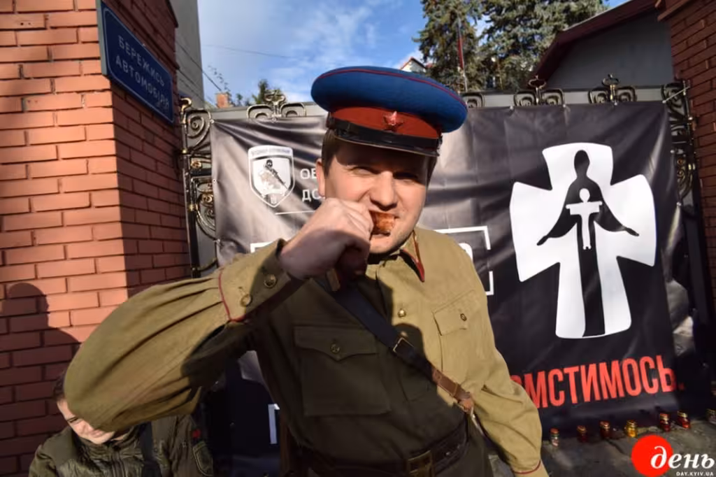 На воротах посольства активісти почепили великий банер із написом «Голодомор 1932–1933. Пам’ятаємо. Помстимося». Крім того, у руках вони тримали колосся пшениці та плакати із зображенням скелета радянського НКВДиста, форма якого у крові, а в руках він тримає колоски пшениці.