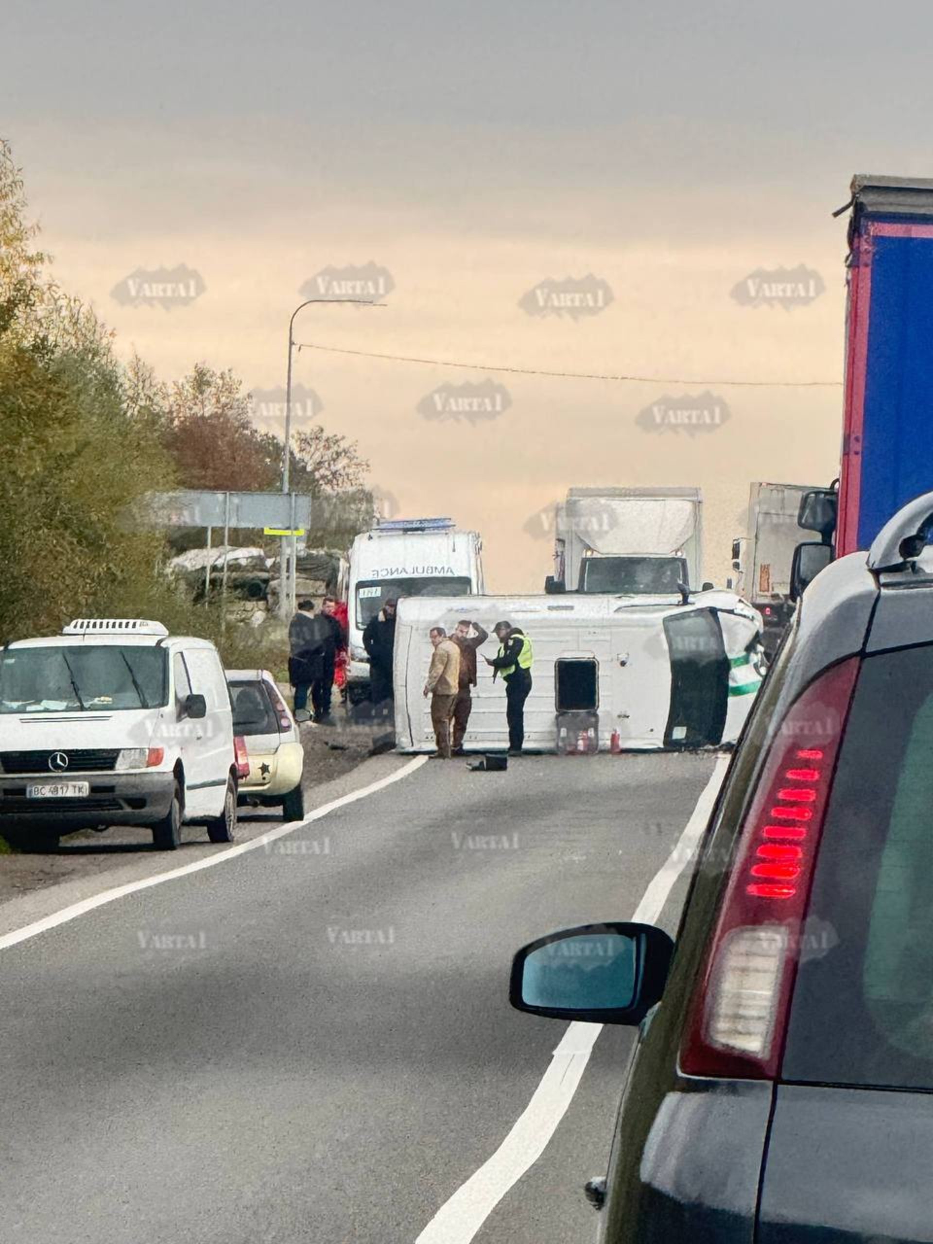ДТП сталась за участі автомобілів Mercedes Vito та Renault, інкасаторський автомобіль від удару перекинувся на бік.