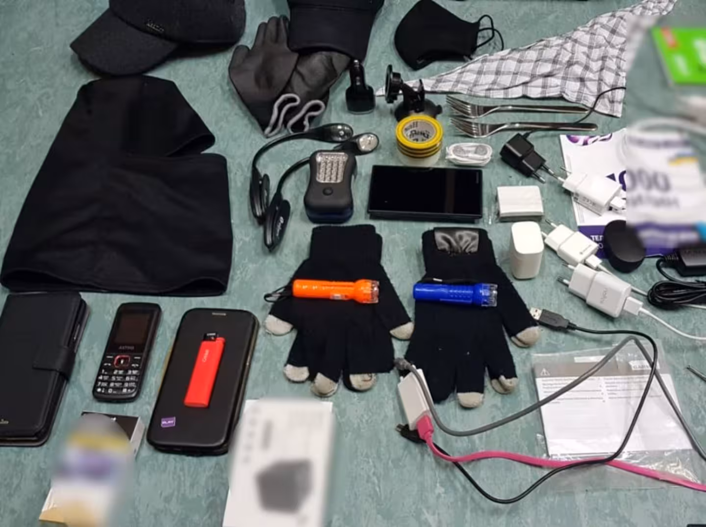 Під час обшуку поліція знайшла у підозрюваних навігаційні пристрої, кілька мобільних телефонів, балаклави, одяг та спеціалізоване обладнання: кабелі, спортивні камери, ліхтарики та рукавички. Крім того, правоохоронці вилучили готівку в різних валютах, роздруківки з обмінного пункту та підтвердження вплат численних сум на BITCOIN.
