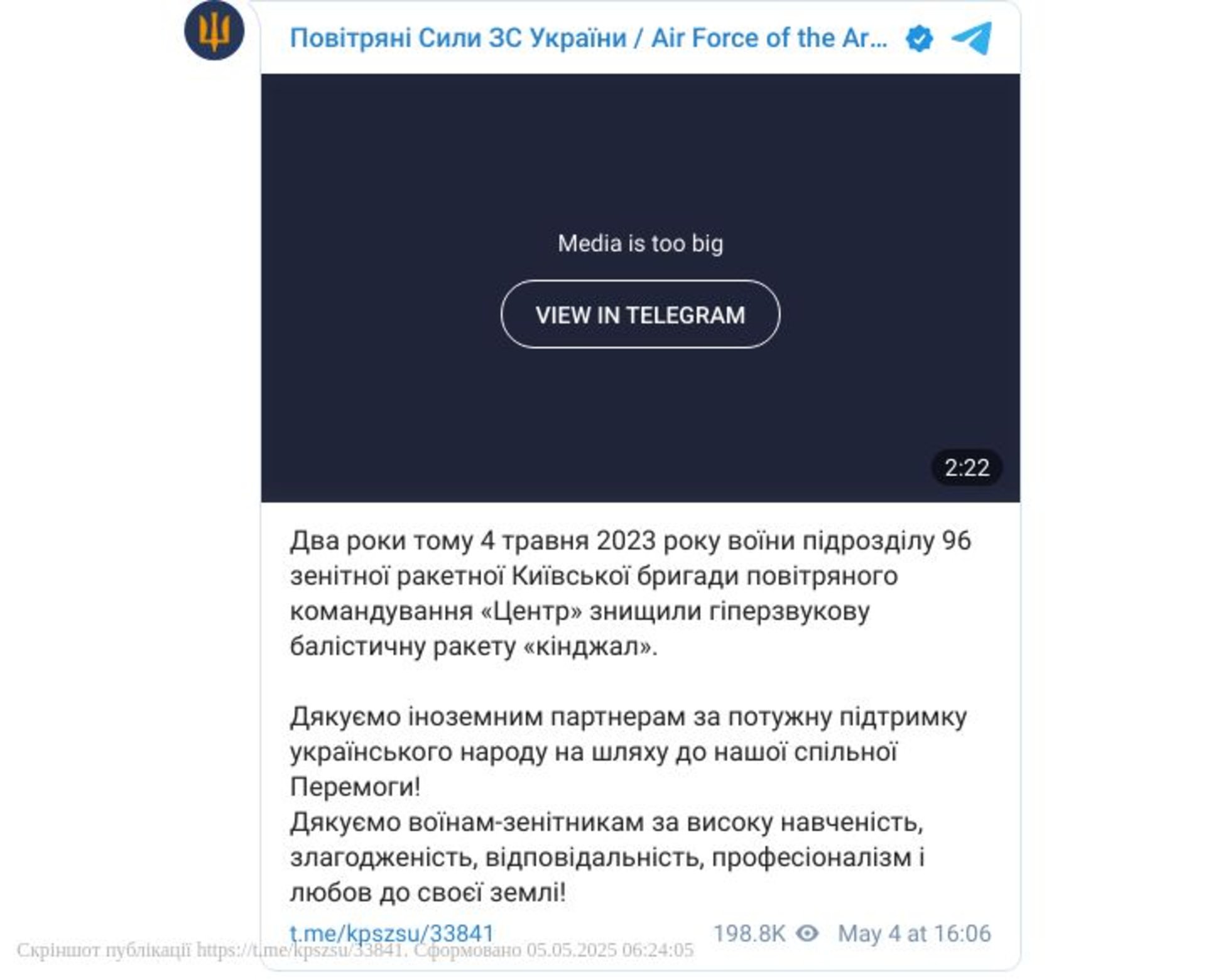 Два роки тому, 4 травня 2023-го, підрозділ 96-ї зенітної ракетної Київської бригади Повітряного командування «Центр» здійснив історичне перехоплення: українські військові вперше у світі збили російську гіперзвукову ракету «Кинджал».