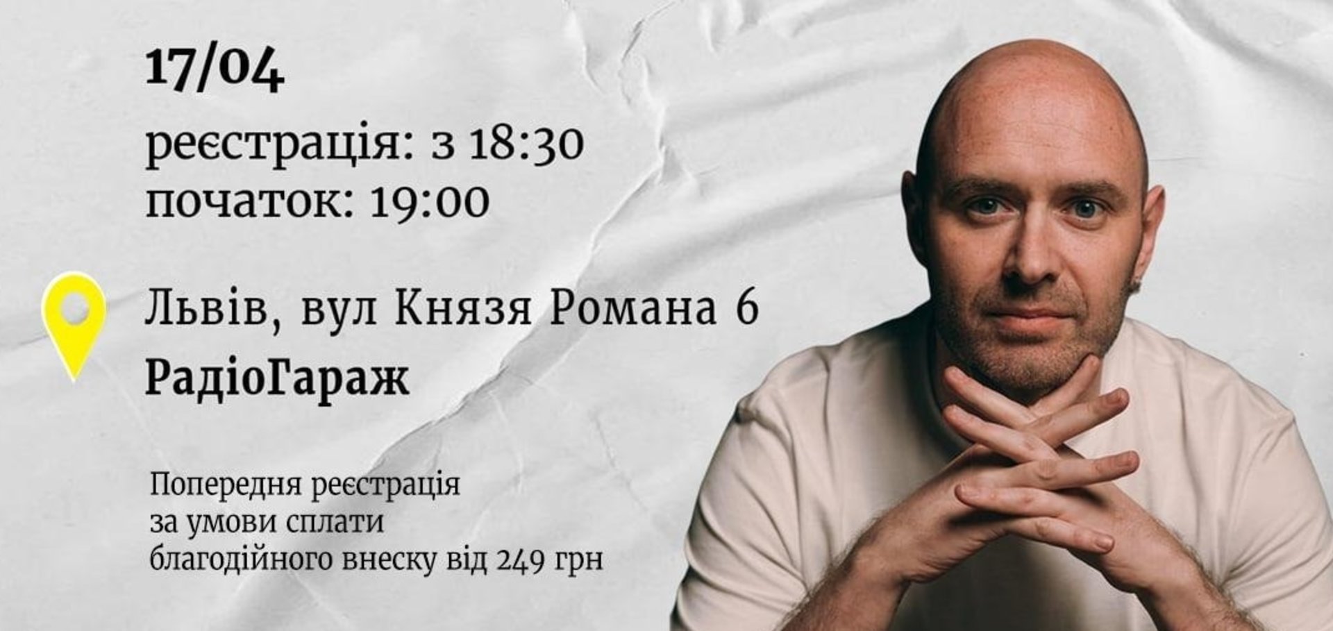 Обов’язкова попередня реєстрація (https://shorturl.at/6v6cf), відвідати зустріч можна після сплати благодійного внеску (https://shorturl.at/f8Vfi).
