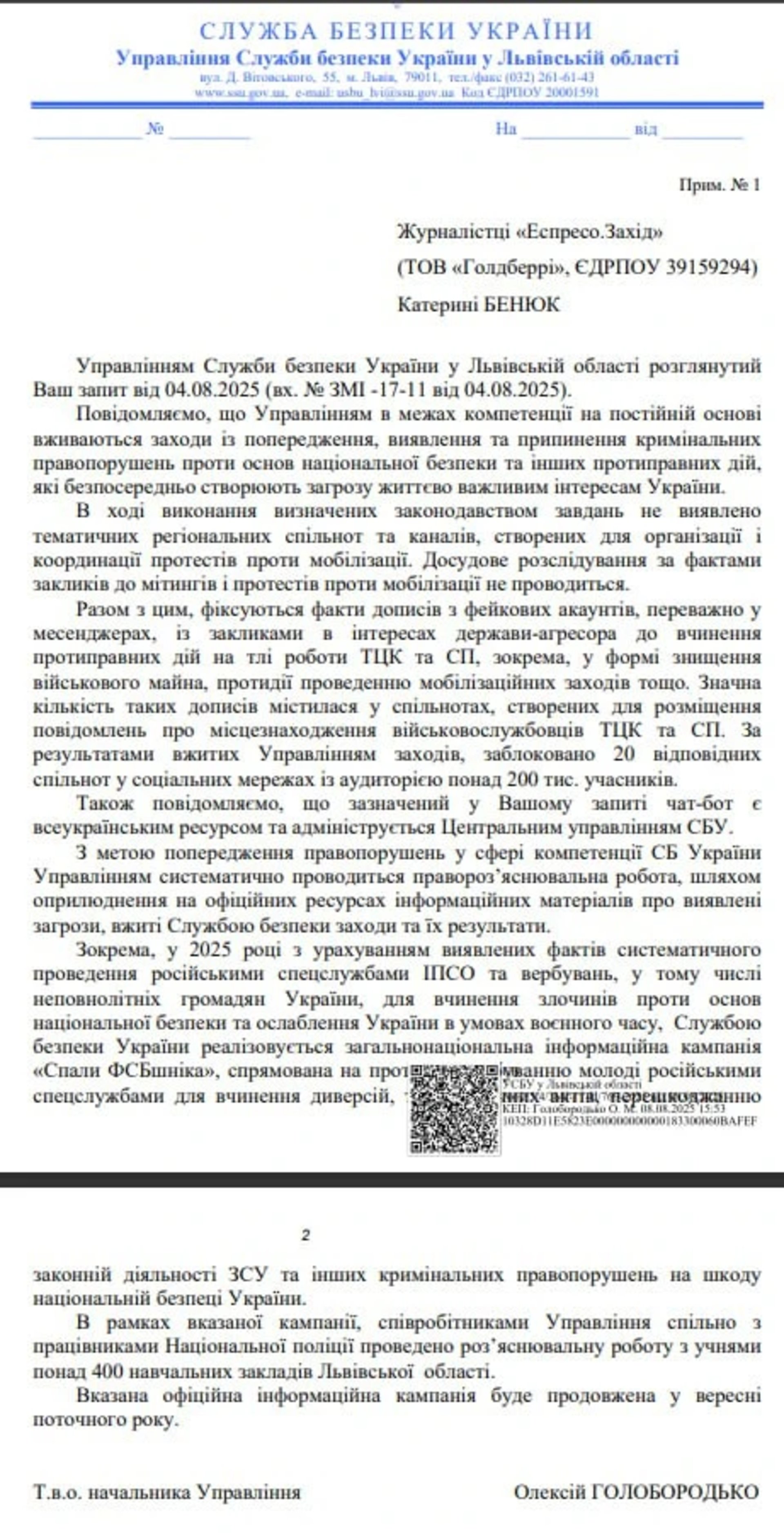 В управлінні СБУ у Львівській області повідомили у відповіді на запит, що на Львівщині не зафіксовано розповсюдження серед місцевого населення друкованих матеріалів із закликами проти мобілізації, і жодного досудового розслідування за фактами перешкоджання мобілізації не розпочинали. Натомість основні провокації відбуваються в інтернеті – через анонімні канали та групи, що поширюють дезінформацію про ЗСУ та мобілізацію, підбурюючи громадян до агресії.