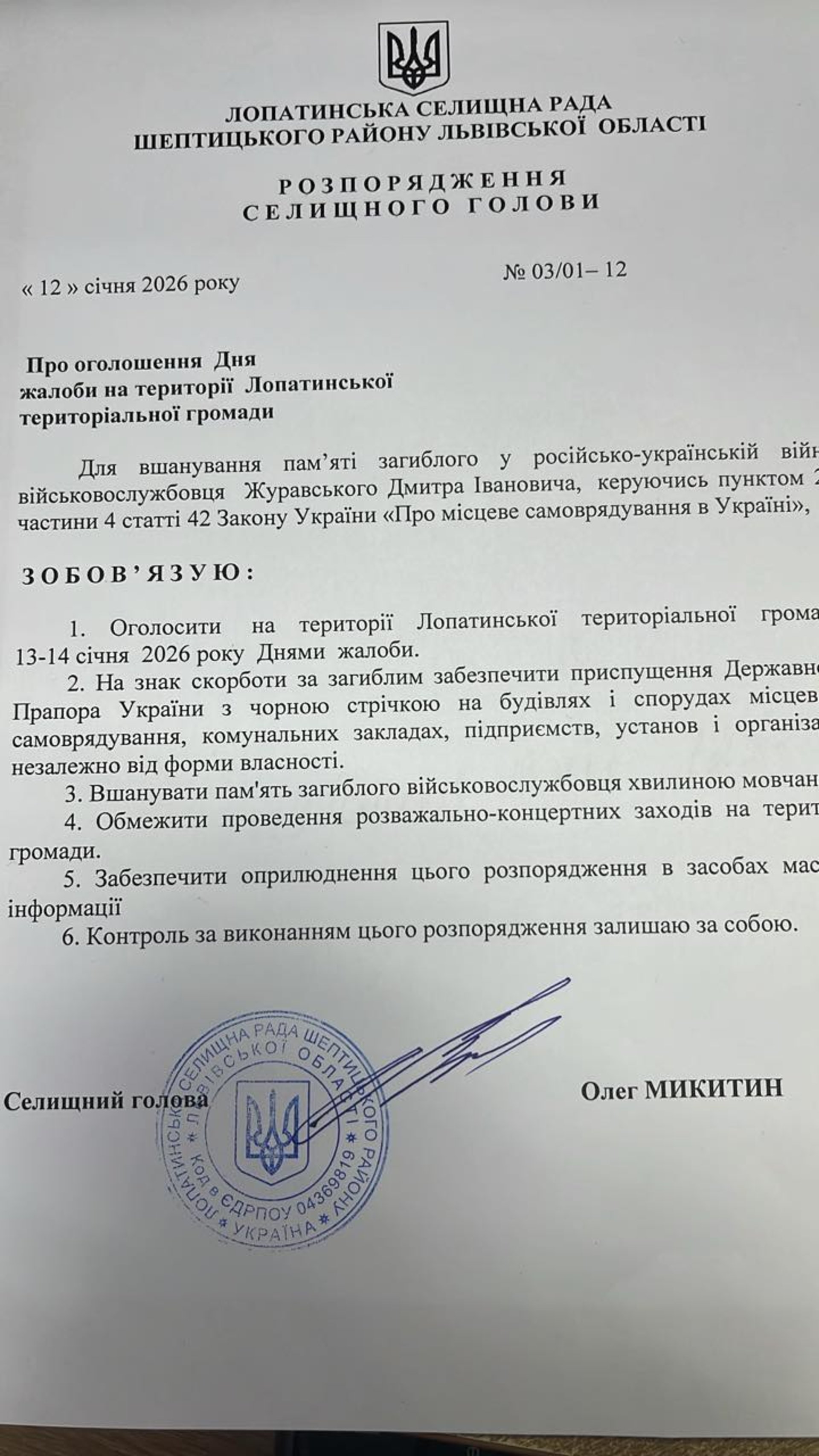 На території Лопатинськоі територіальної громади 13-14 січня 2026 року оголошуються Днями жалоби у звʼязку з похованням загиблого військовослужбовця Журавського Дмитра Івановича.