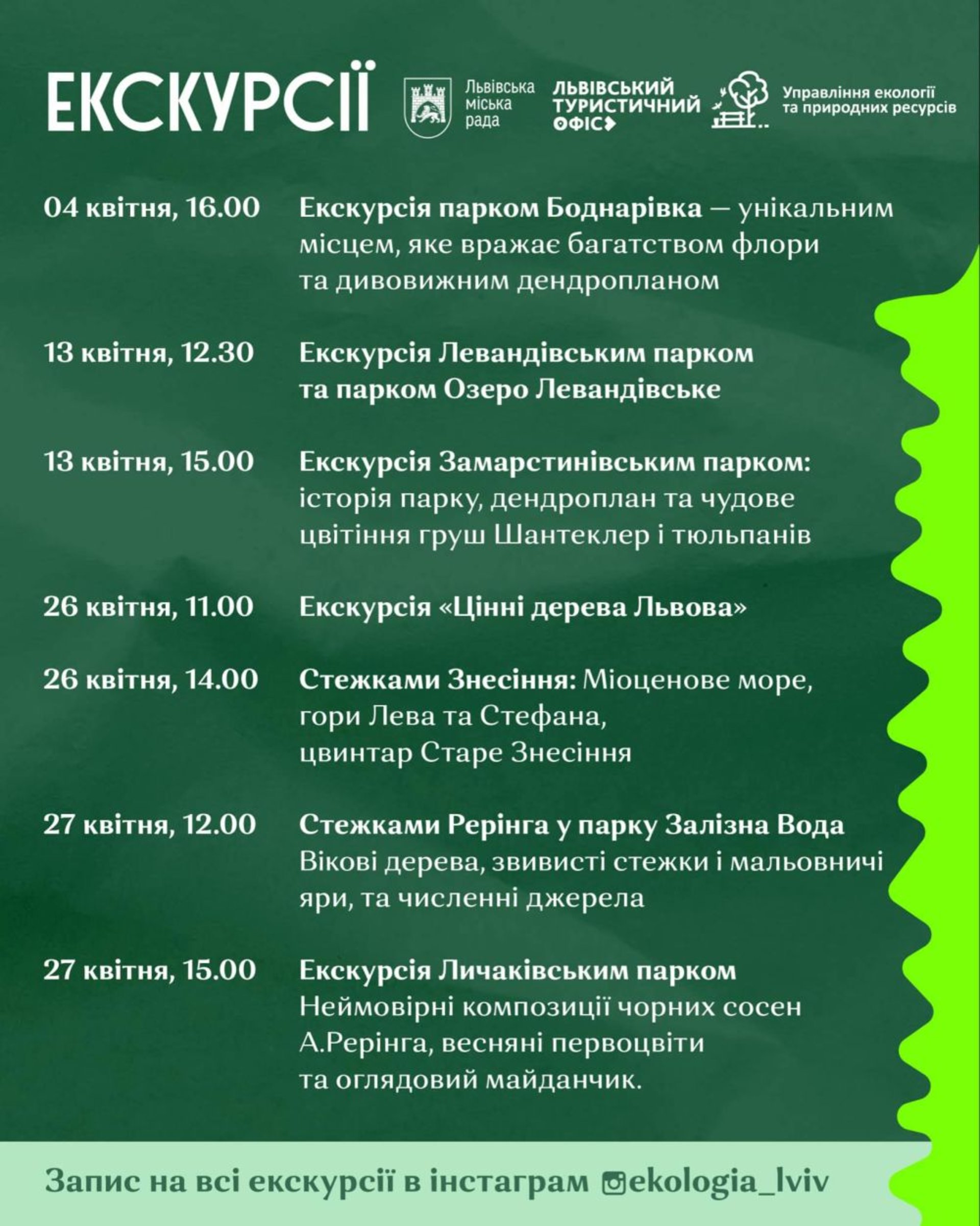 26 квітня 11:00 – Екскурсія «Цінні дерева Львова у парку І.Франка». Реєстрація – за посиланням: https://forms.gle/jAnKCorK52RyyMC4A