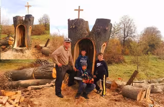 «Ми їхали, бачимо, липу ріжуть на кубани. Зупинили процес, впросили, щоб зробити з цього щось важливіше. Словом, пізніше працював я над цим сім днів. Зараз господарі ділянки вже працюють над дахом до каплиці. Плануємо, щоб всередині була Матір Божа і блакитна арка», — каже митець.