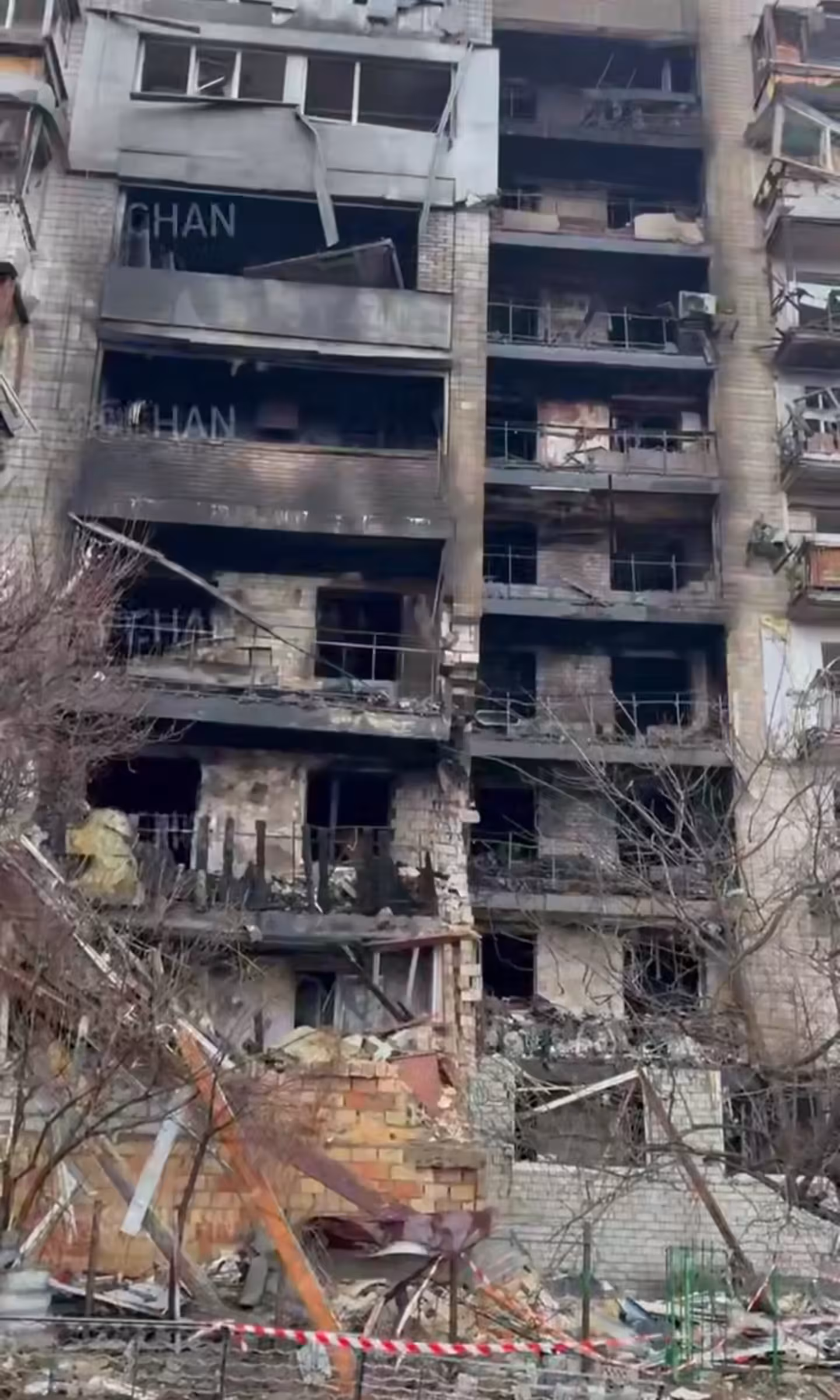Вогонь, спричинений ворожим ударом, охопив значну частину житлового будинку у Вишгороді. Як зазначають рятувальники, вигоріли квартири з 1-го до 6-го поверху дев'ятиповерхівки. Внутрішні приміщення повністю знищені, а вікна багатьох квартир перетворилися на чорні провалля.