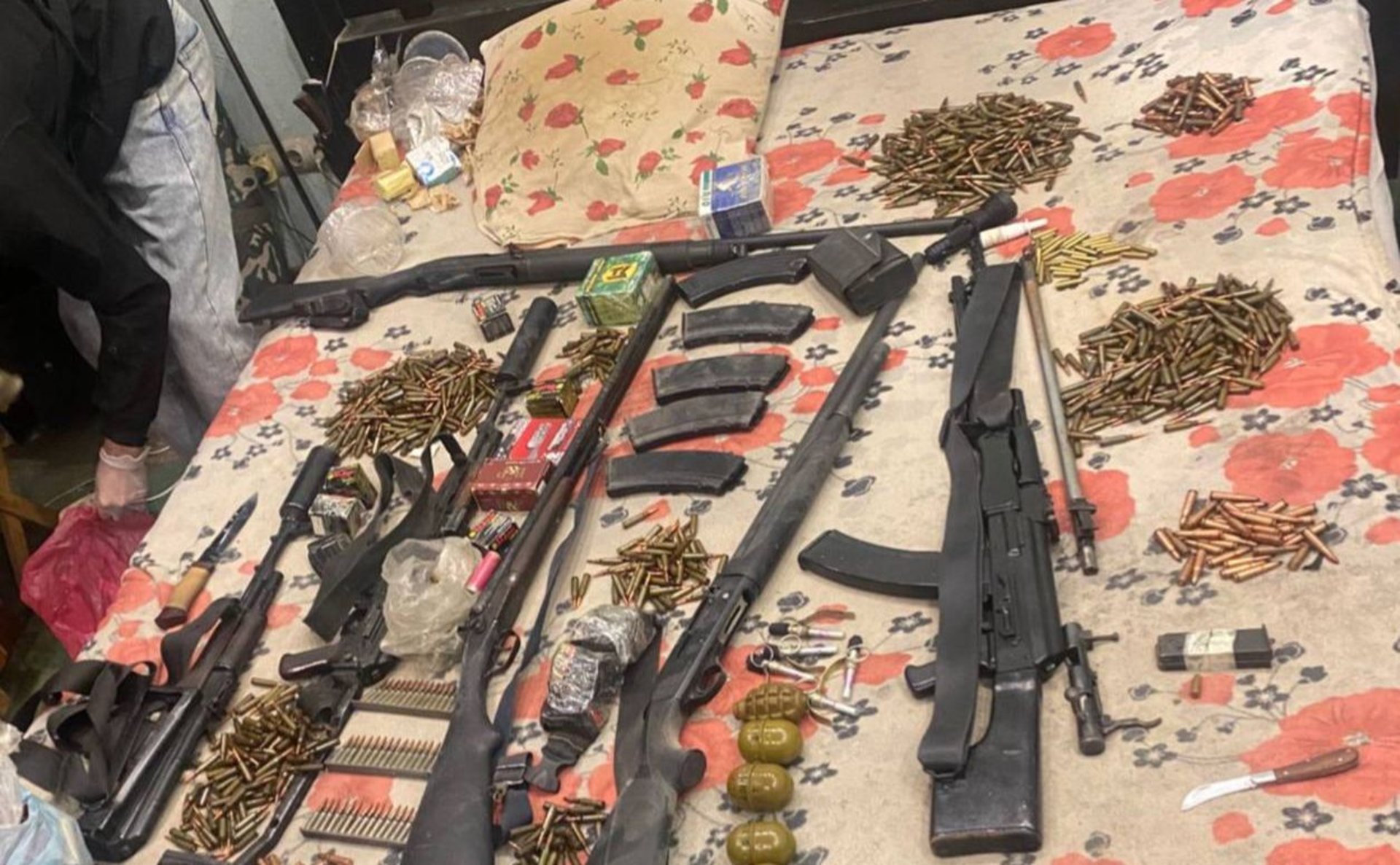 Правоохоронці провели у помешканні обшук і знайшли ручний кулемет Калашникова, два автомати Калашникова складні укорочені (АКСУ) з глушниками та сім магазинів до них, три гладкоствольні гвинтівки, чотири гранати «РГД-5», одну гранату «Ф-1», п’ять підривачів типу «УЗРГМ» і понад 1600 набоїв різного калібру.