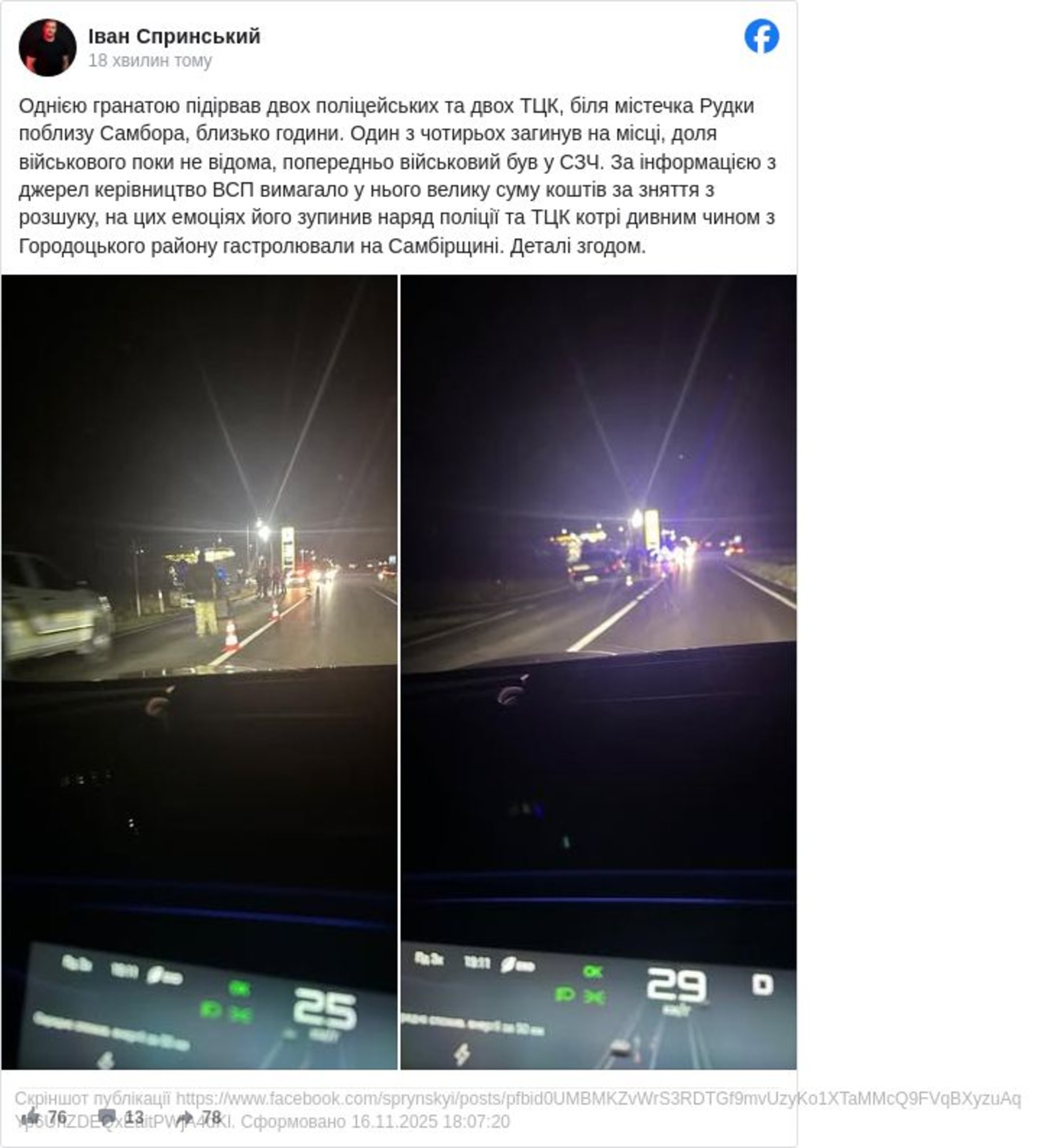 З допису Івана Спринського відомо, що чоловік однією гранатою підірвав двох поліцейських та двох ТЦК, біля містечка Рудки поблизу Самбора. Доля військового поки невідома, попередньо військовий був у СЗЧ. За інформацією з джерел керівництво ВСП вимагало у нього велику суму коштів за зняття з розшуку, на цих емоціях його зупинив наряд поліції та ТЦК котрі дивним чином з Городоцького району гастролювали на Самбірщині.