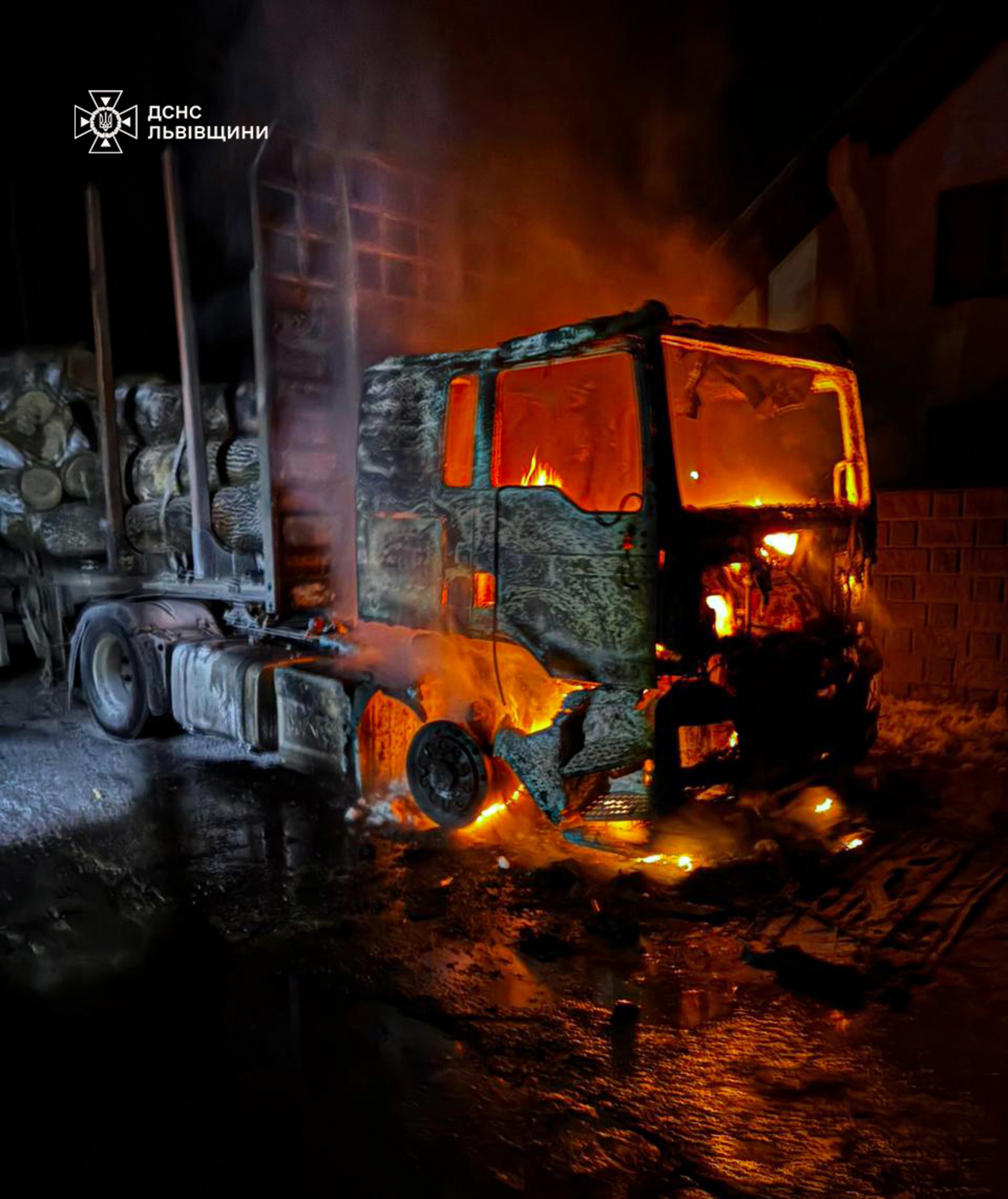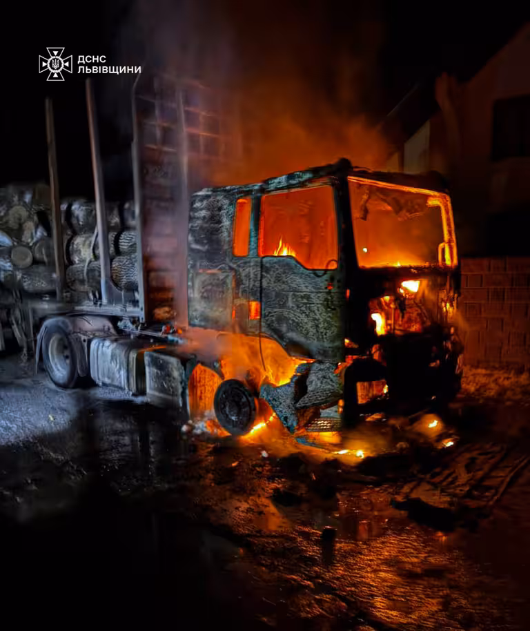 Горіла кабіна автомобіля. Врятовано: причіп та 18 куб. м деревини. Пожежу локалізовано о 04:20 та ліквідовано о 04:41 надзвичайниками. Внаслідок займання ніхто не постраждав.