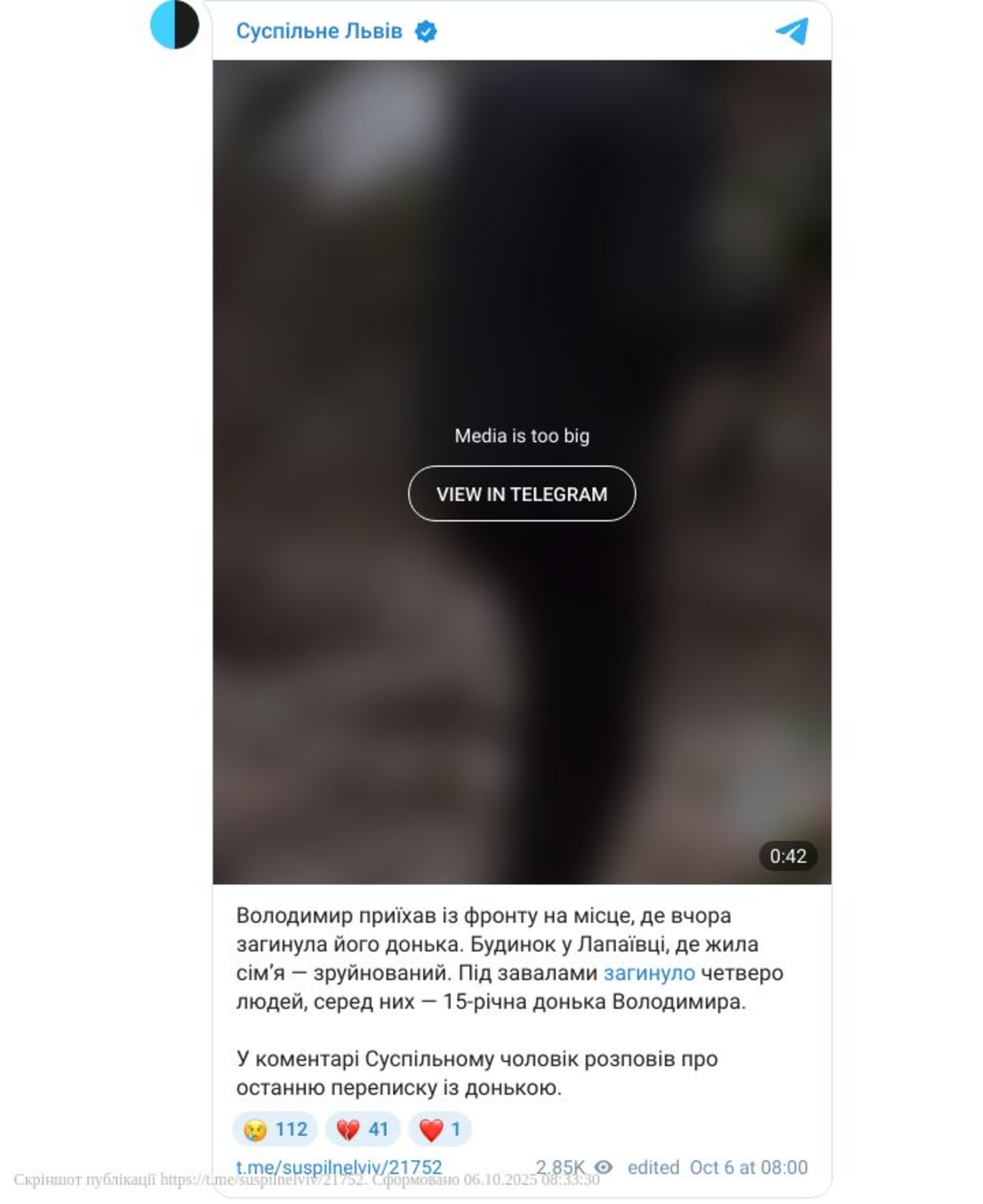 Сьогодні, 6 жовтня, батько 15-річної загиблої Анастасії Гриців внаслідок удару по Лапаївці - Володимир приїхав із фронту на місце, де вчора загинула його донька. Про це пише Суспільне.