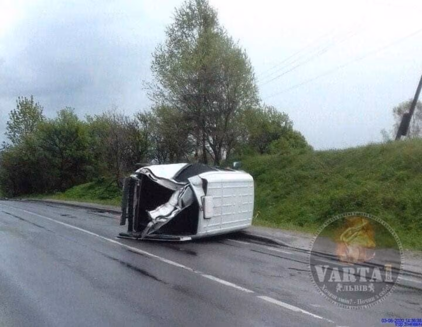 ДТП сталася в селі Нагірне Сколівського району. Бус лежить на проїжджій частині на боку.