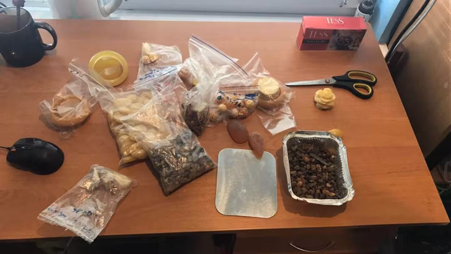 Під час обшуків за місцем його проживання та двох організаторів співробітники спецслужби виявили бурштинові плити вагою п’ятнадцять кілограмів, одинадцять кілограмів готових виробів та заготовок, обладнання для обробки каменю. Вилучене «сонячне каміння» відправлено на експертизу.