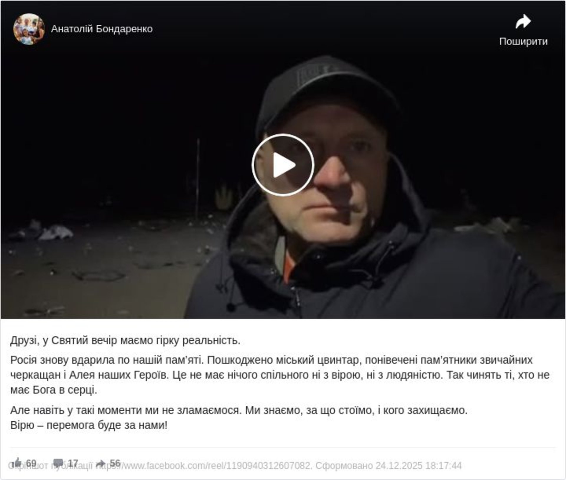 «Росія знову вдарила по нашій пам’яті. Пошкоджено міський цвинтар, понівечені пам’ятники звичайних черкащан і Алея наших Героїв. Це не має нічого спільного ні з вірою, ні з людяністю. Так чинять ті, хто не має Бога в серці», — йдеться у повідомленні.