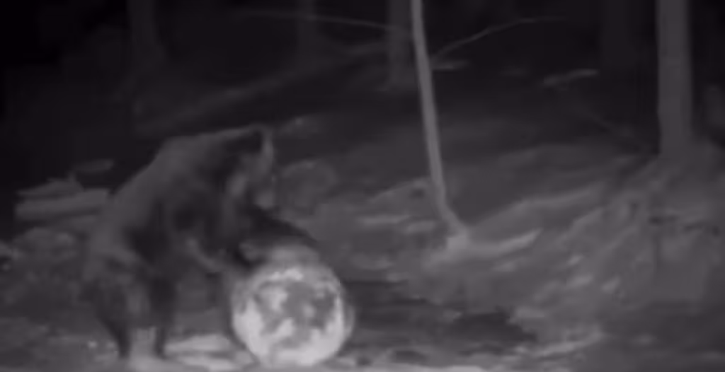 На відео, яке оприлюднили лісники, можна побачити, як ведмідь грає з тюком, наче маленька дитина. Застрибнув на тюк, але не втримався і "з'їхав" на землю. Потім почав катати його снігом, як людина, яка ліпить сніговика. При цьому ставав на задні лапи й кумедно обнюхував "здобич".
