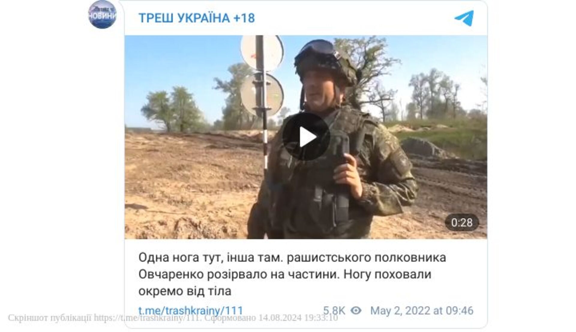 Внаслідок прямого влучення, російського полковника Овчаренко розірвало на шматки. Ногу поховали окремо від тіла. Про подробиці похорону розповів у сюжеті його співвітчизник.