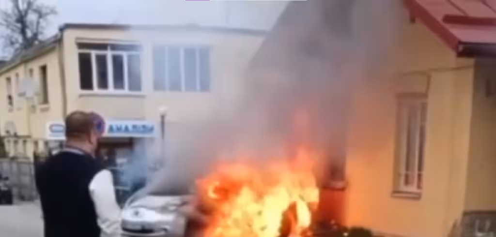На відео видно, що палаючий транспортний засіб дуже близько розташований біля одного з будинків, на стінах якого з'явився чорний слід від полум'я.
