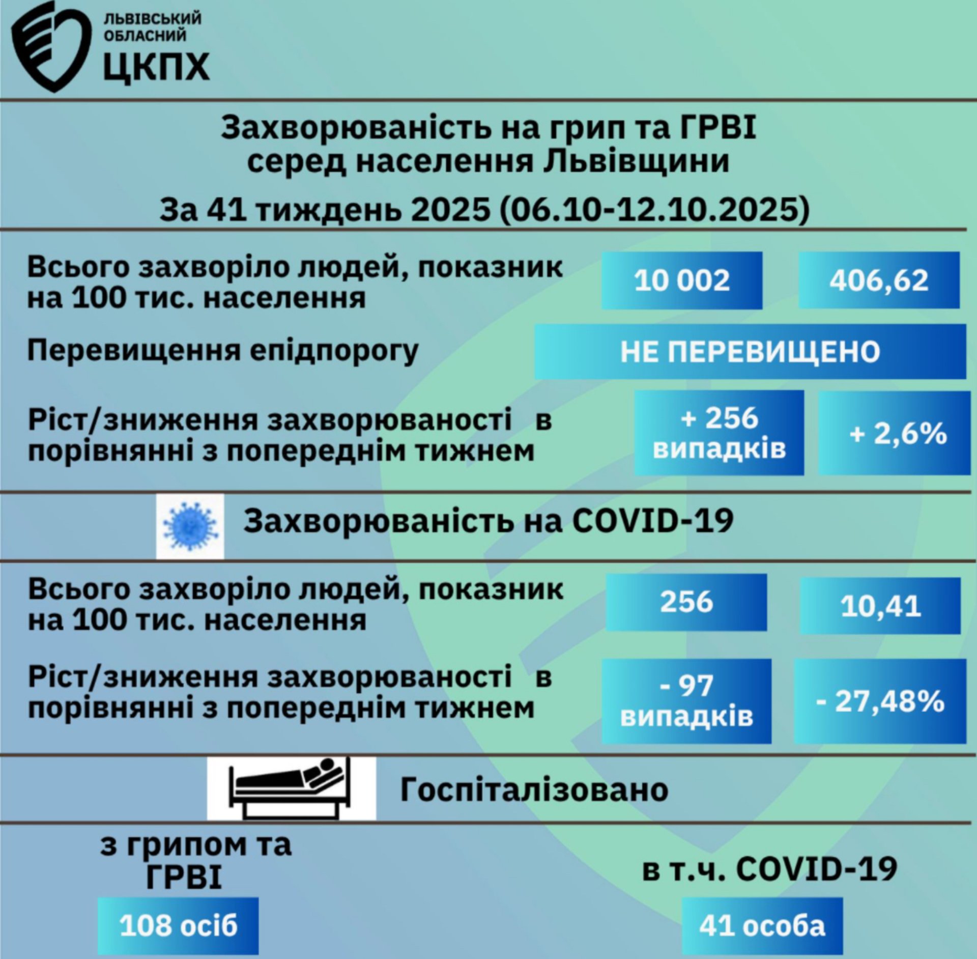 Загалом госпіталізовано 108 пацієнтів, в тому числі, з коронавірусною інфекцією - 41 особа.