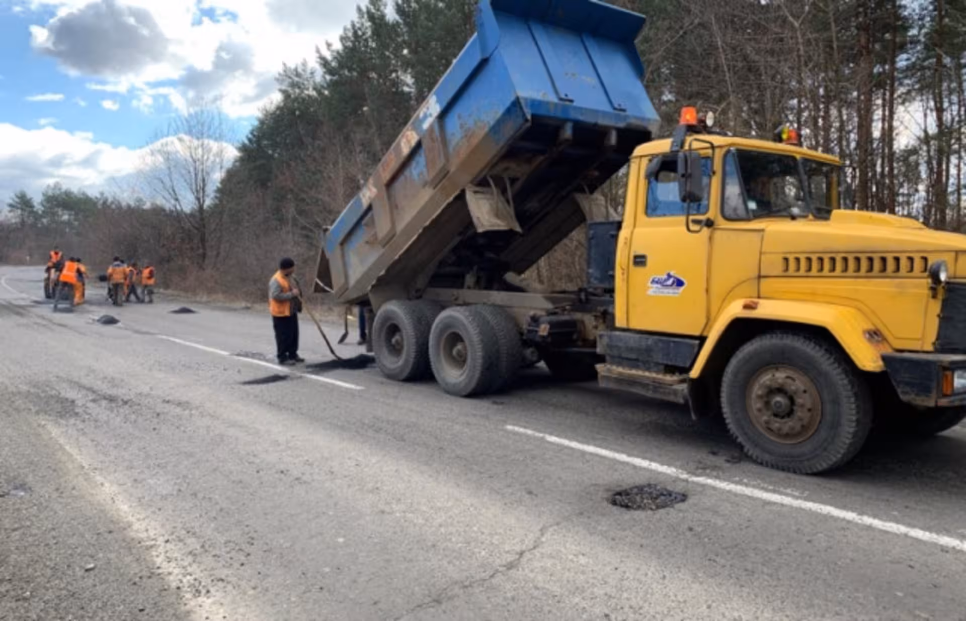 Працівники засипають ями, розгрібають граблями, а потім притискають. Робиться все так, що залатані ями виступають від рівня дороги на 1—1,5 сантимента. Якість суміші така, що незабаром розпадеться.