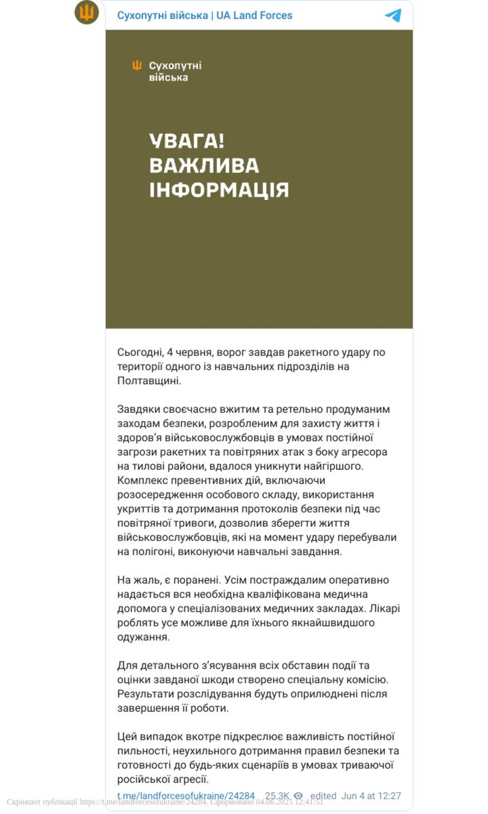 Цей випадок вкотре підкреслює важливість постійної пильності, неухильного дотримання правил безпеки та готовності до будь-яких сценаріїв в умовах триваючої російської агресії, наголошують у Сухопутних військах.
