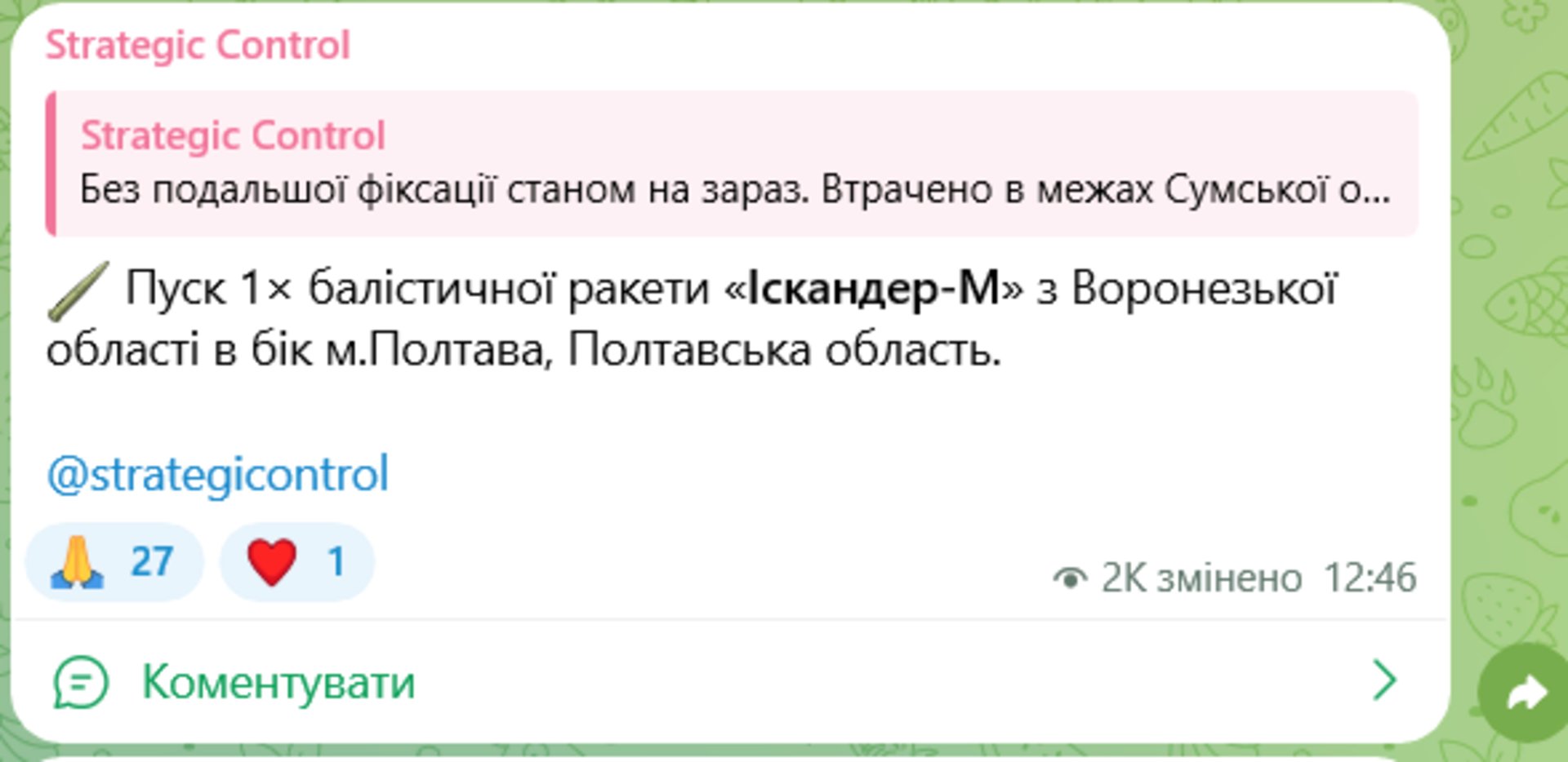 Відомо, що Росія запустила ракету типу "Іскандер-М" із Воронезької області.