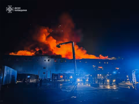 За даними ДСНС Київщини, о 00:50 внаслідок чергової ворожої атаки безпілотників на території Бориспільського району сталося загоряння складського приміщення площею 15 000 м².