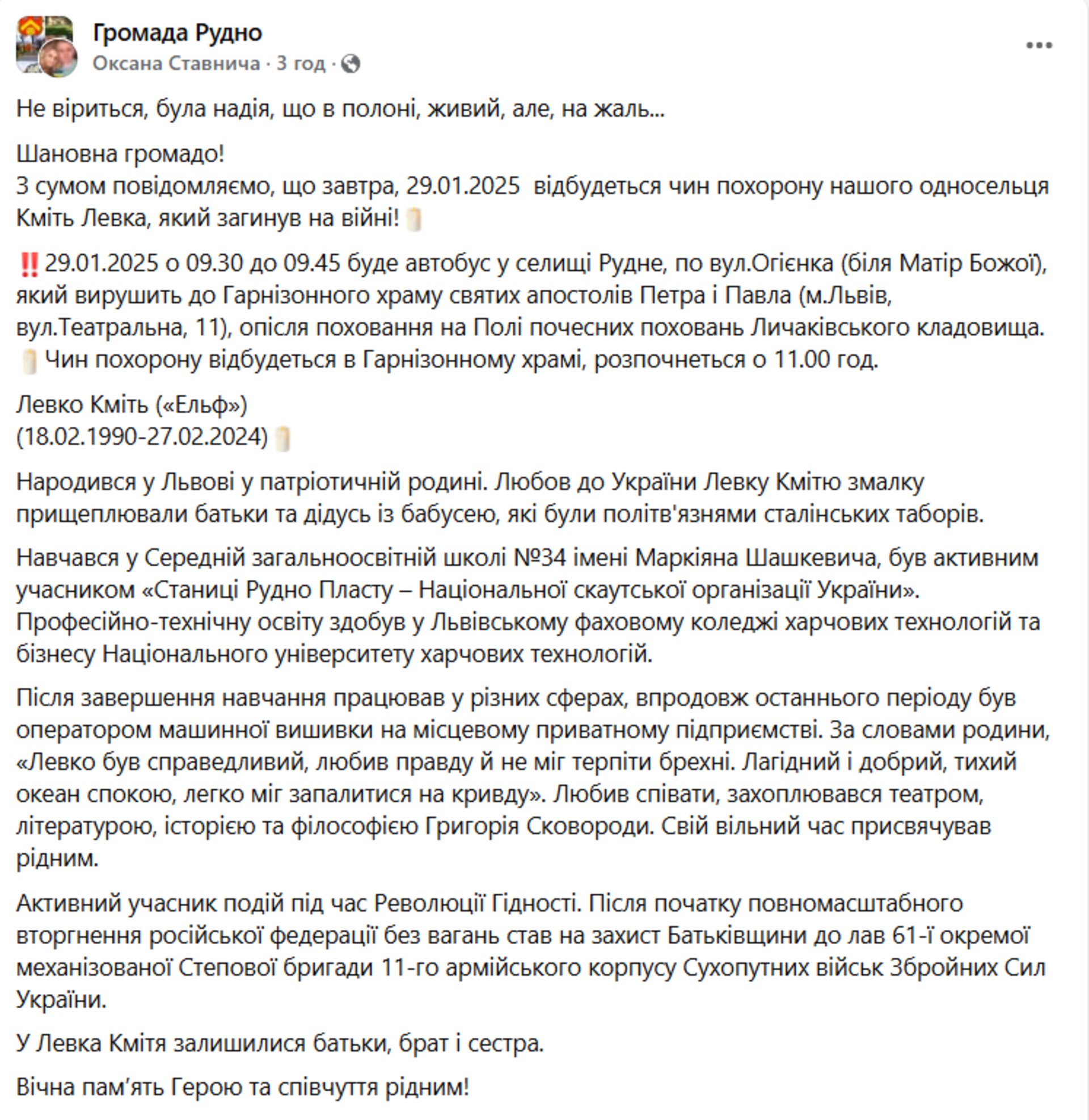Левко Кміть («Ельф») (18.02.1990-27.02.2024) Народився у Львові у патріотичній родині.