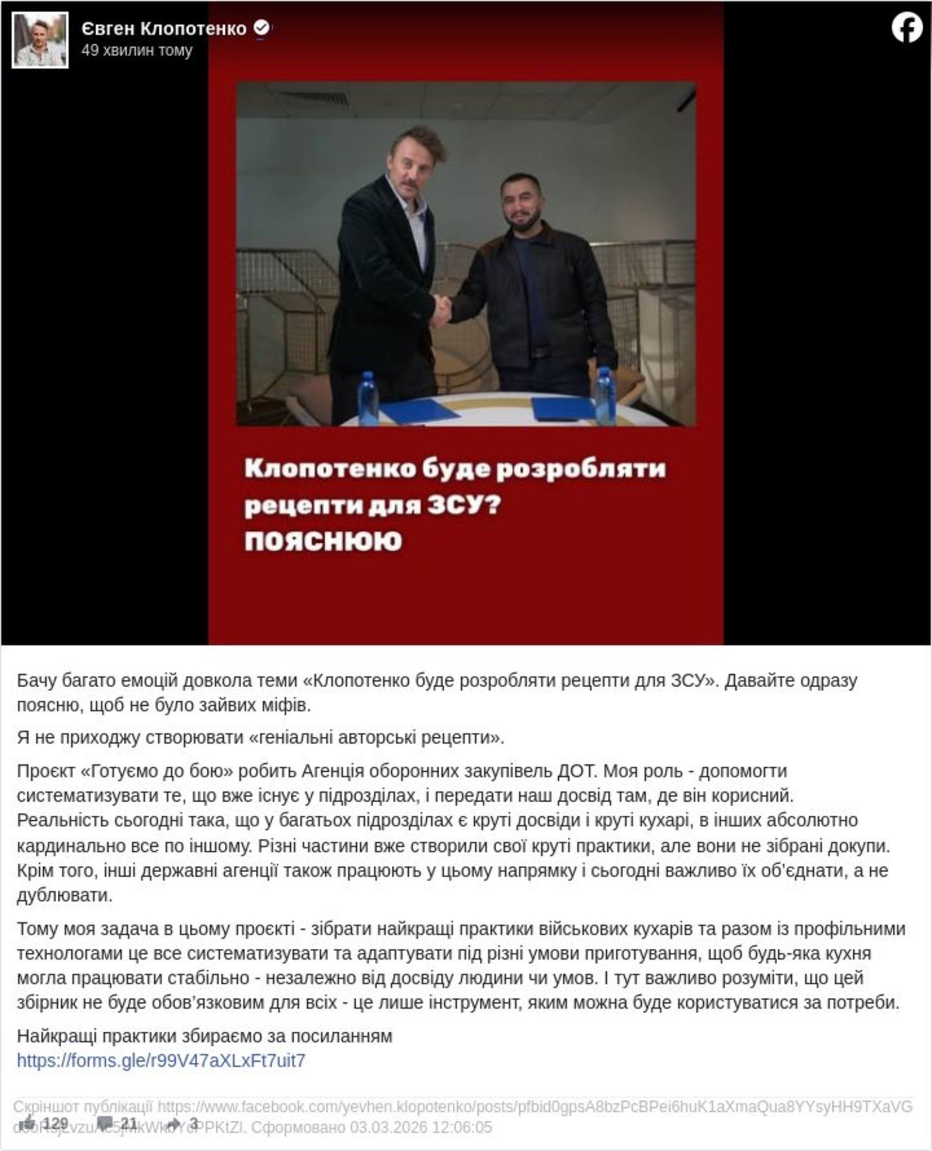 Сам Євген Клопотенко, на своїй сторінці у ФБ зазначає, що «я не приходжу створювати «геніальні авторські рецепти». Проєкт «Готуємо до бою» робить Агенція оборонних закупівель ДОТ. Моя роль - допомогти систематизувати те, що вже існує у підрозділах, і передати наш досвід там, де він корисний. Реальність сьогодні така, що у багатьох підрозділах є круті досвіди і круті кухарі, в інших абсолютно кардинально все по іншому. Різні частини вже створили свої круті практики, але вони не зібрані докупи. Крім того, інші державні агенції також працюють у цьому напрямку і сьогодні важливо їх об’єднати, а не дублювати.