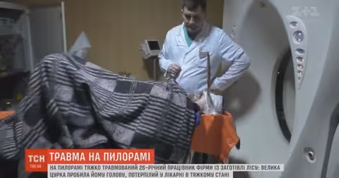 Нещасний випадок на пилорамі, тяжко травмований працівник приватної фірми із заготівлі лісу, йдеться в «ТСН.12.00». Цурка потрапила на велику глибину мозку. Чоловіка прооперували і видалили око.
