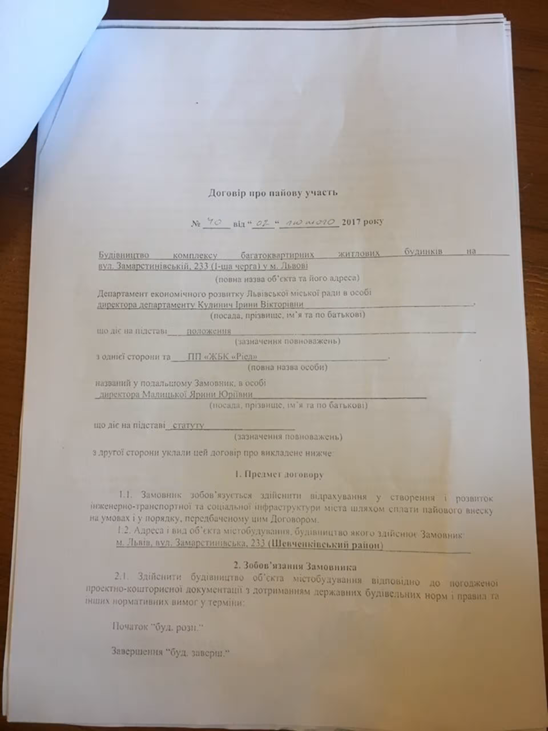 Кінцево невідомо хто саме і чи справді отримав квартири в новозбудованому 10-поверховому житловому кварталі, першу чергу якого якраз хочуть здати в експлуатацію і про що кінцево могли домовлятись у далекому 2007 році керівники МВС та «ЖБК Ріел», однак логічно, що інвестиційний внесок таки мусить сплатити один з найбільших забудовників Львова. Зокрема про це саме це йдеться у документах, підписаних керівником департаменту економіки Іриною Кулинич та директором забудовника Малицькою Яриною.