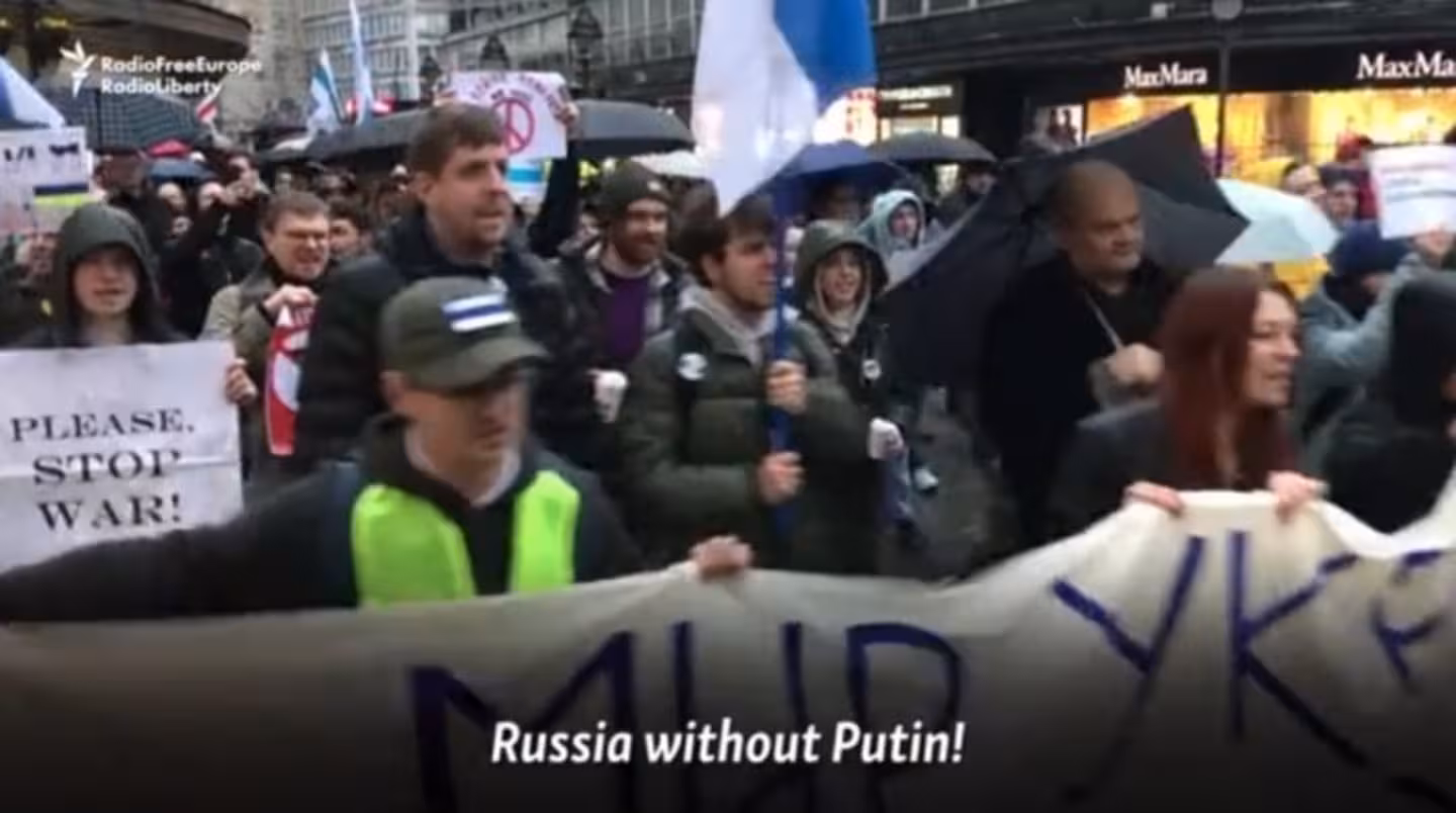 Демонстранти тримали плакати із закликами до президента Росії Володимира Путіна «тримати руки подалі від України», а також гасла «Свобода для України», «Зупиніть військове божевілля» і «304 дні смерті і страху».
