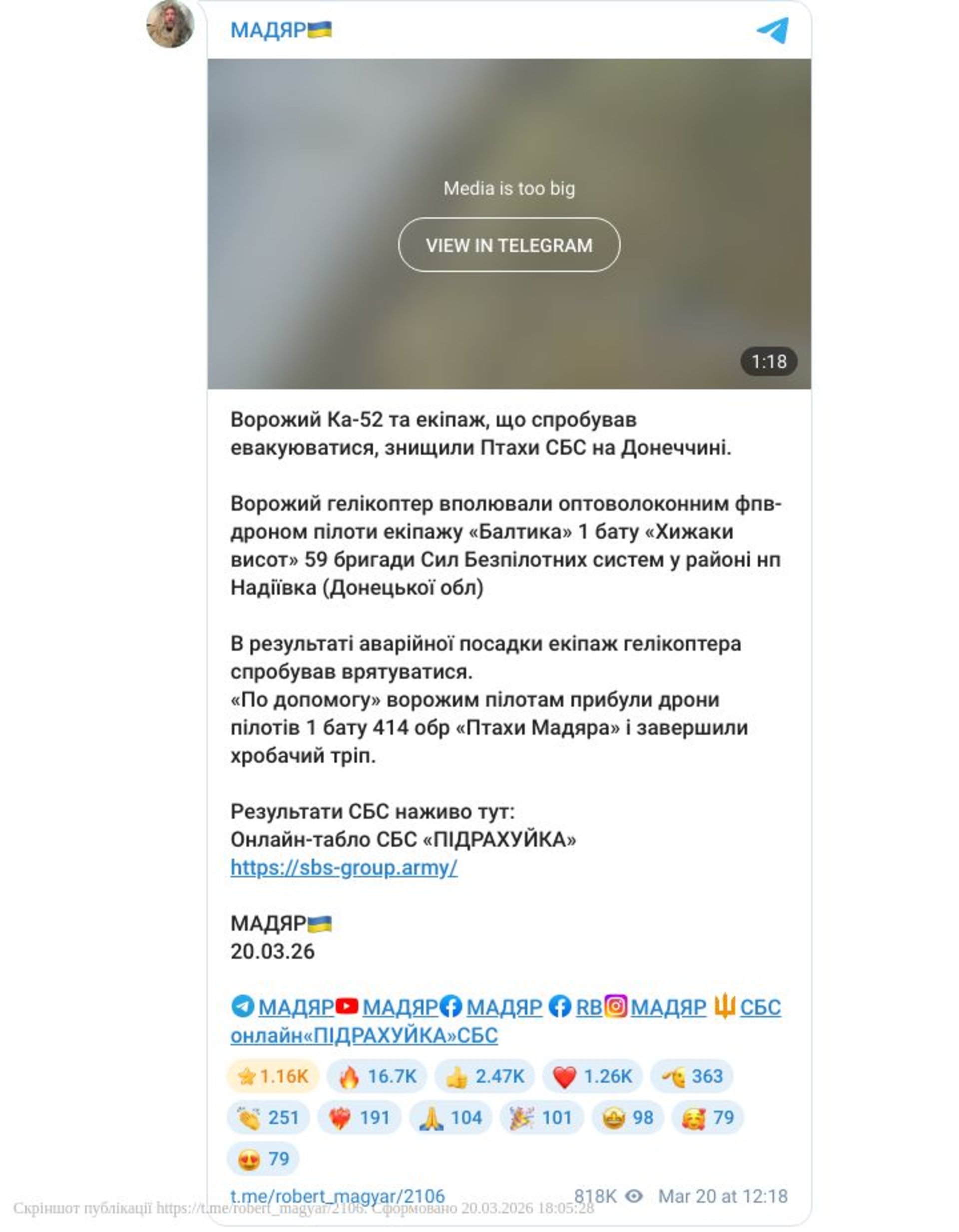 Командувач Сил безпілотних систем ЗСУ Роберт Бровді (Мадяр) уточнив, що ворожий Ка-52 знищили пілоти 59-ї ОШБр СБС в районі населеного пункту Надіївка Донецької області.