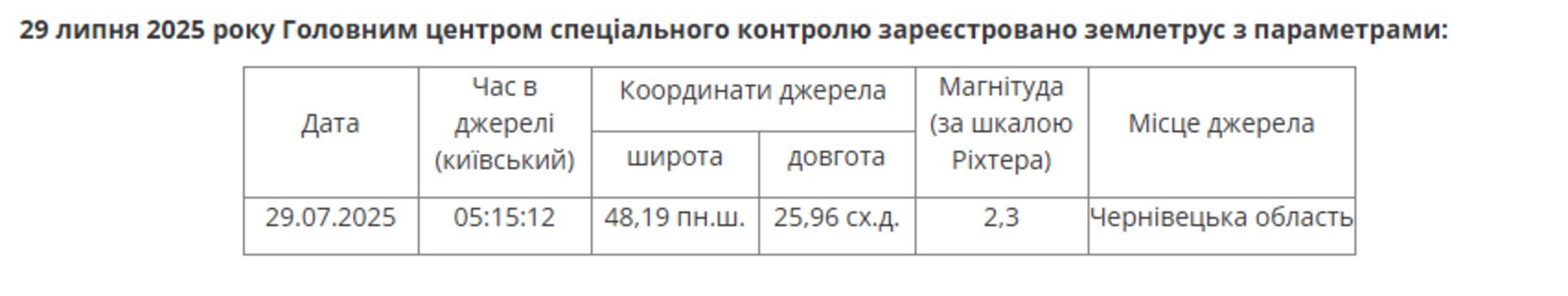 29 липня 2025 року о 05:15:12 Головним центром спеціального контролю зареєстровано землетрус районі населених пунктів Волока та Грушівка, Чернівецького району, Чернівецької області, магнітудою 2,3 (за шкалою Ріхтера), на глибині 2 км.