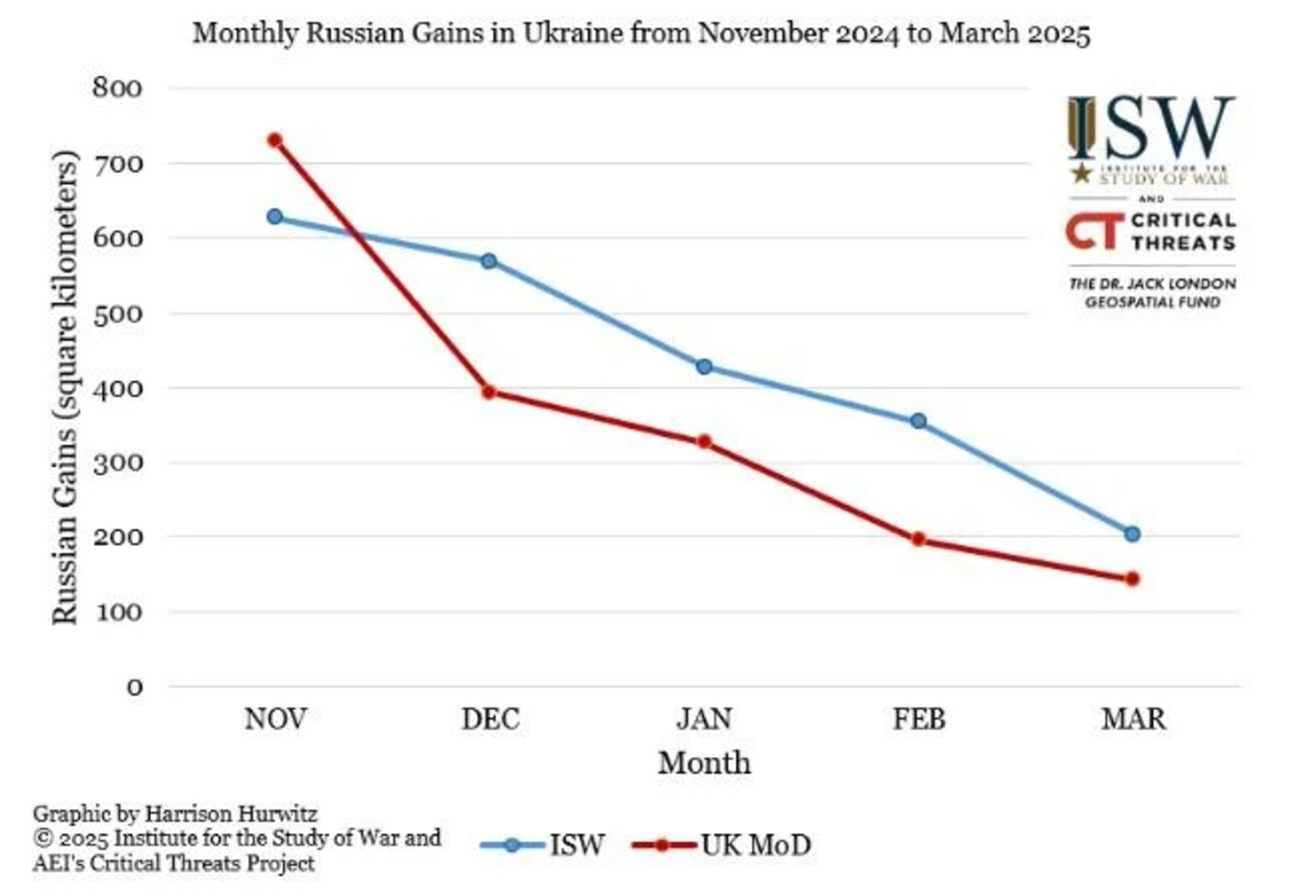 Схожі висновки оприлюднило й Міністерство оборони Великої Британії, хоч і з дещо іншими цифрами. За їхніми оцінками, у березні російські війська просунулись лише на 143 кв. км, а ще у листопаді — на 730 кв. км. Аналітики ISW зазначають, що різниця пояснюється використанням іншої методології, однак обидва джерела фіксують загальну тенденцію до сповільнення наступу.