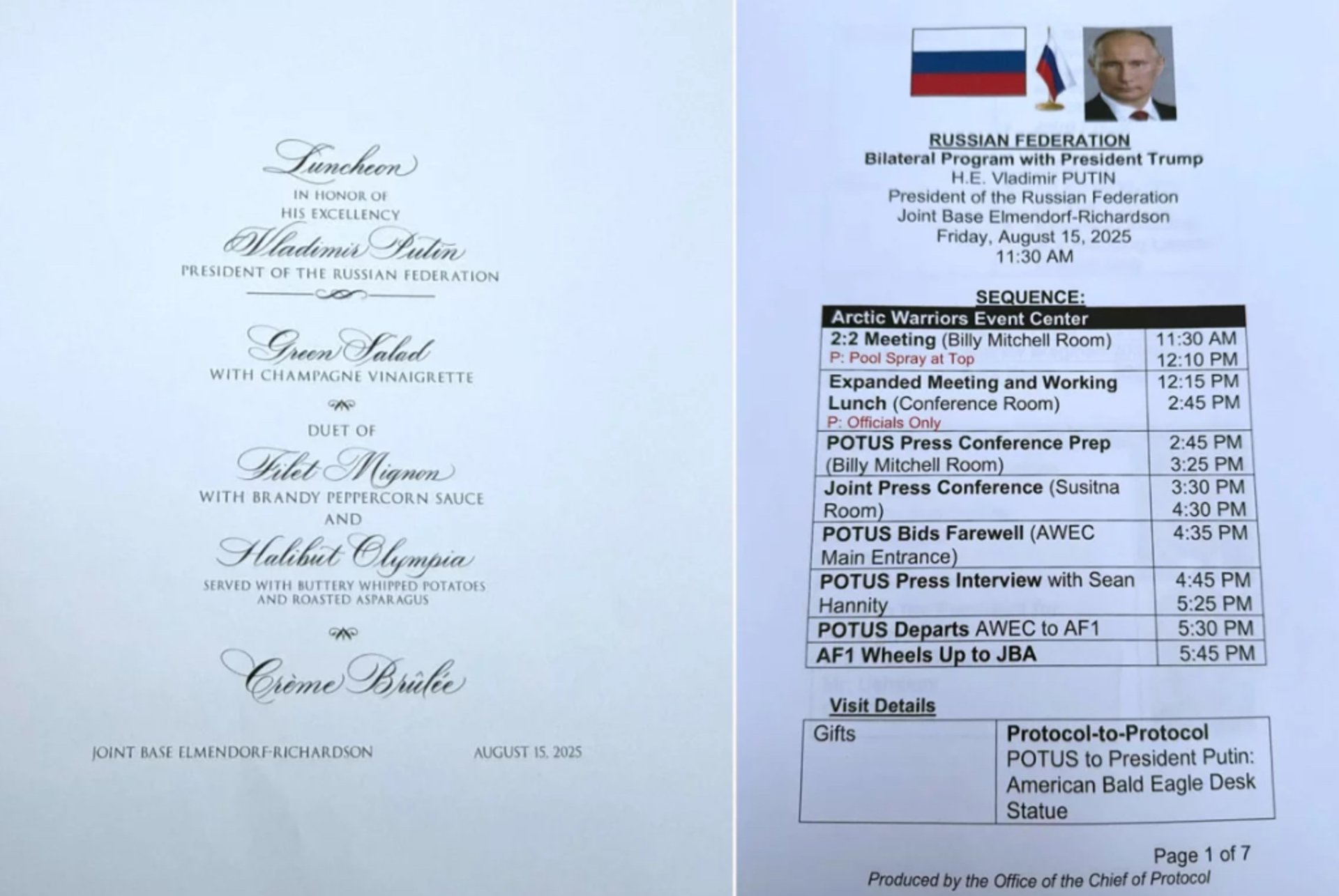 Документи також містили деталі урочистого обіду, організованого на честь володимира путіна, з повним описом меню.