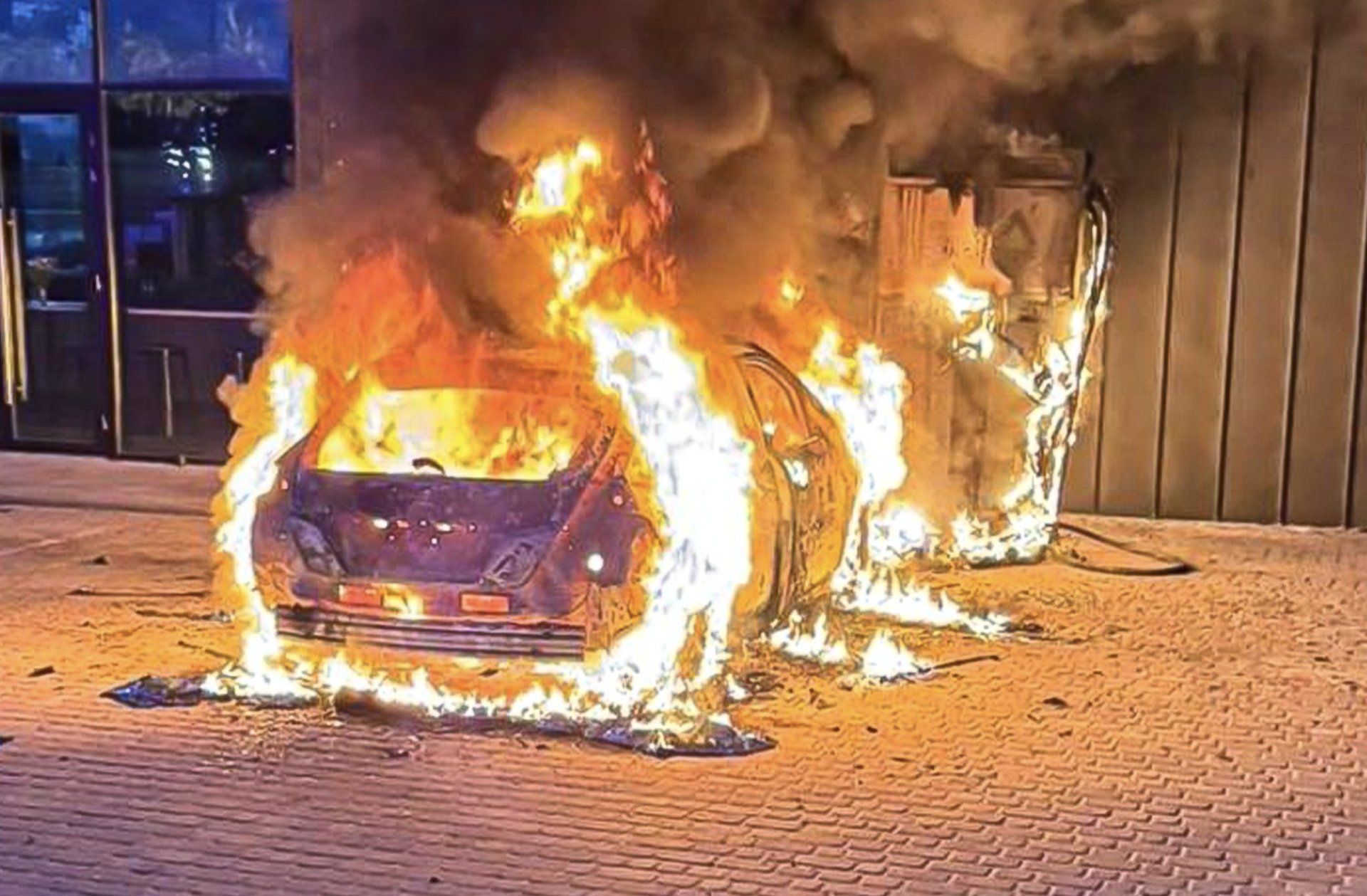 Загорівся електромобіль Nissan та зарядна станція. Існувала загроза перекидання вогню на поруч розташовану будівлю.
