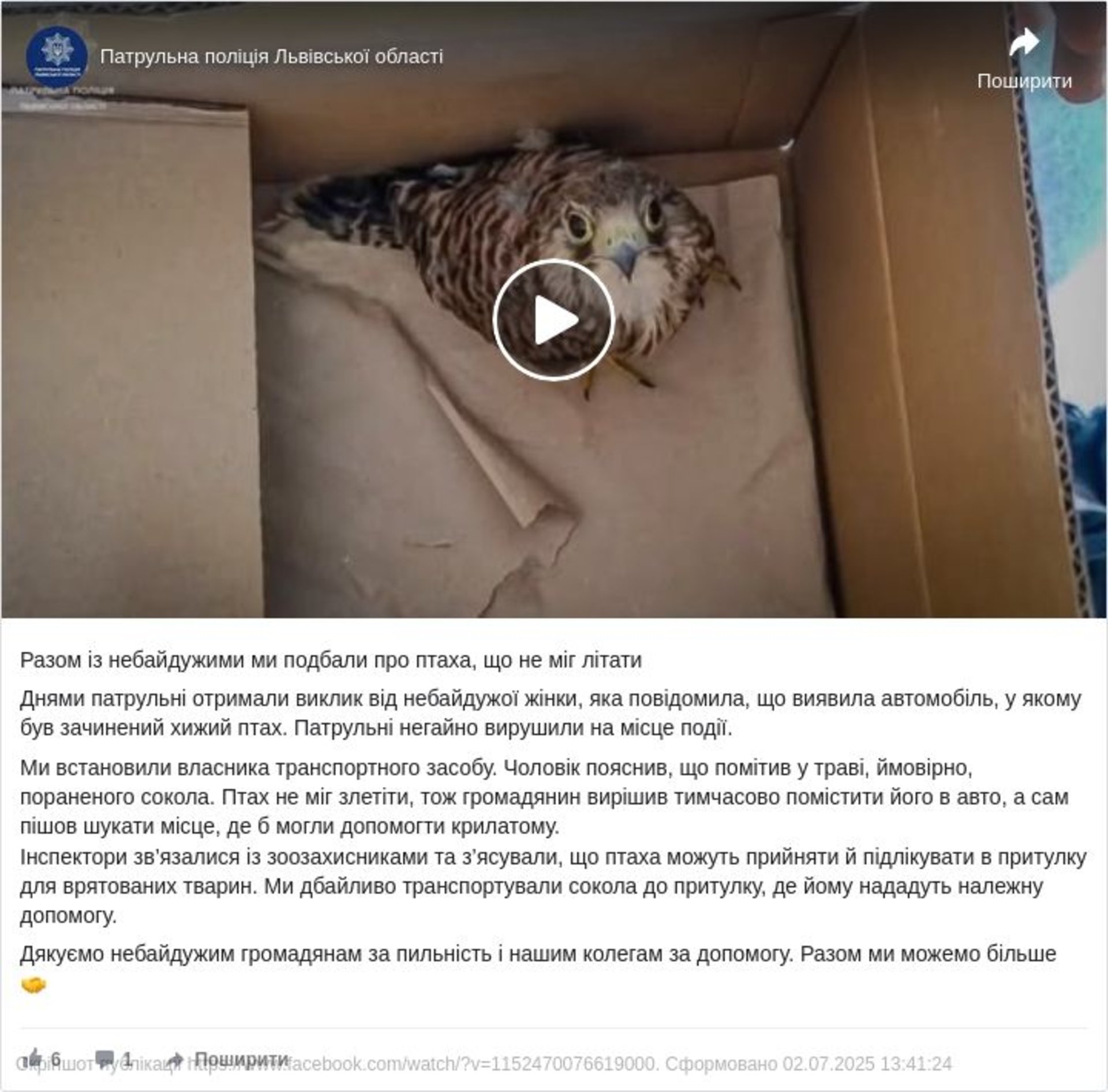 Як повідомили у Патрульній поліції Львівщини, учора патрульні отримали виклик від небайдужої жінки, яка повідомила, що виявила автомобіль, у якому був зачинений хижий птах. Патрульні негайно вирушили на місце події. Правоохоронці встановили власника транспортного засобу. Чоловік пояснив, що помітив у траві, ймовірно, пораненого сокола. Птах не міг злетіти, тож громадянин вирішив тимчасово помістити його в авто, а сам пішов шукати місце, де б могли допомогти крилатому.