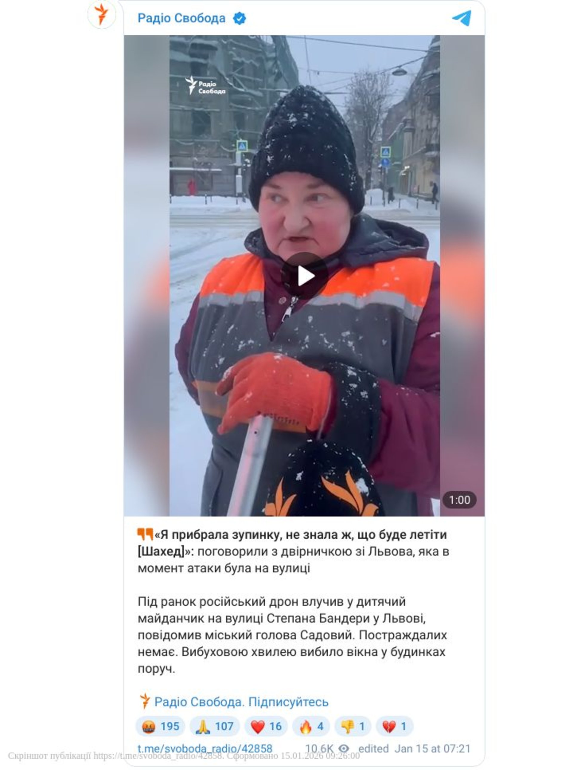 У Львові комунальниця пані Оля прибирала сніг під час атаки шахеда (ВІДЕО)