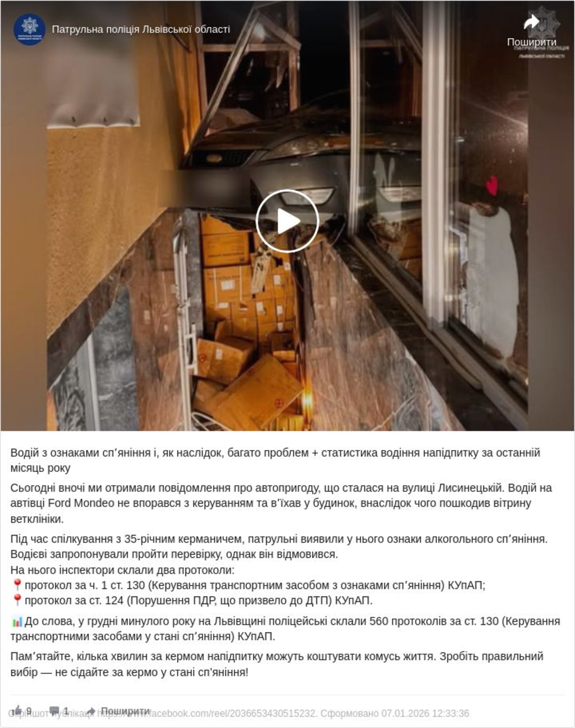 «Сьогодні вночі ми отримали повідомлення про автопригоду, що сталася на вулиці Лисинецькій. Водій на автівці Ford Mondeo не впорався з керуванням та вʼїхав у будинок, внаслідок чого пошкодив вітрину ветклініки.