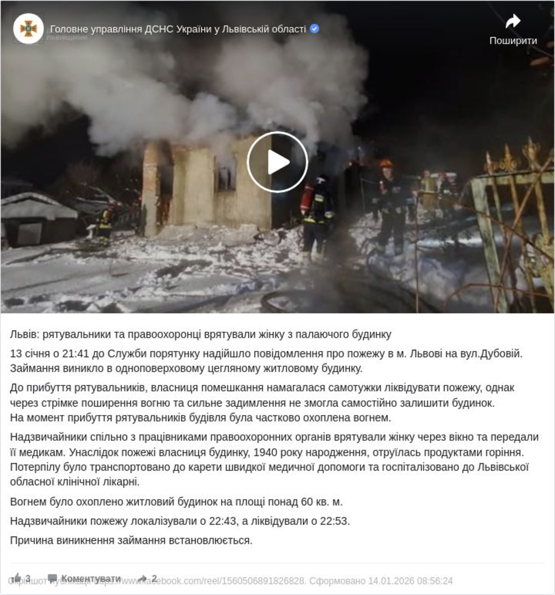 13 січня о 21:41 надійшло повідомлення про пожежу на вул. Дубовій у Львові. Займання виникло в одноповерховому цегляному житловому будинку.