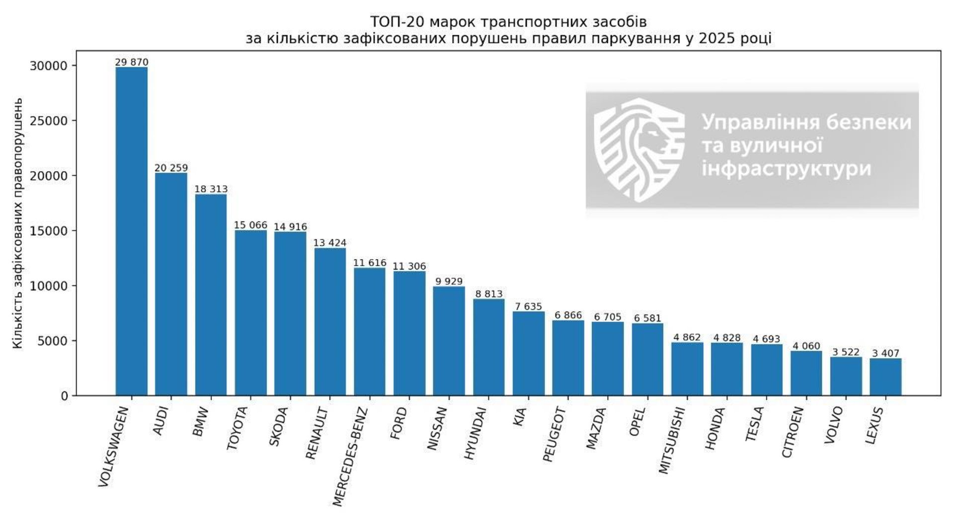 Як зазначається, інформація про марку автомобіля зазначається у постанові про притягнення водія до адміністративної відповідальності. В Управлінні безпеки та вуличної інфраструктури зібрали ці дані за 2025 рік і маємо список марок автомобілів, які найчастіше фігурували у зафіксованих порушеннях: