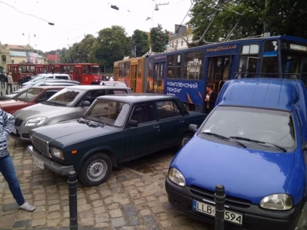 У Львові пасажири трамваю перенесли автомобіль, який перешкоджав руху транспорту (відео)